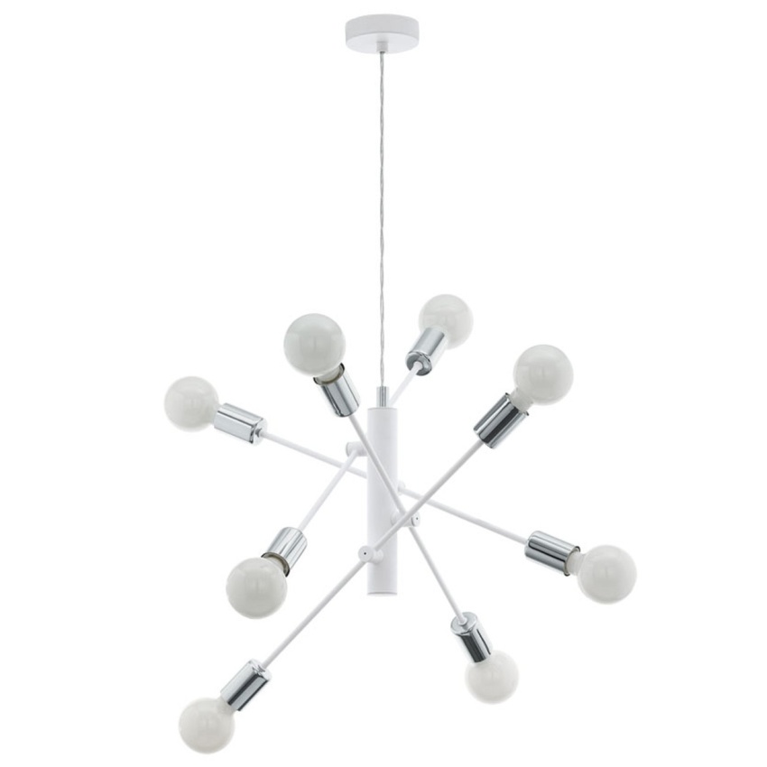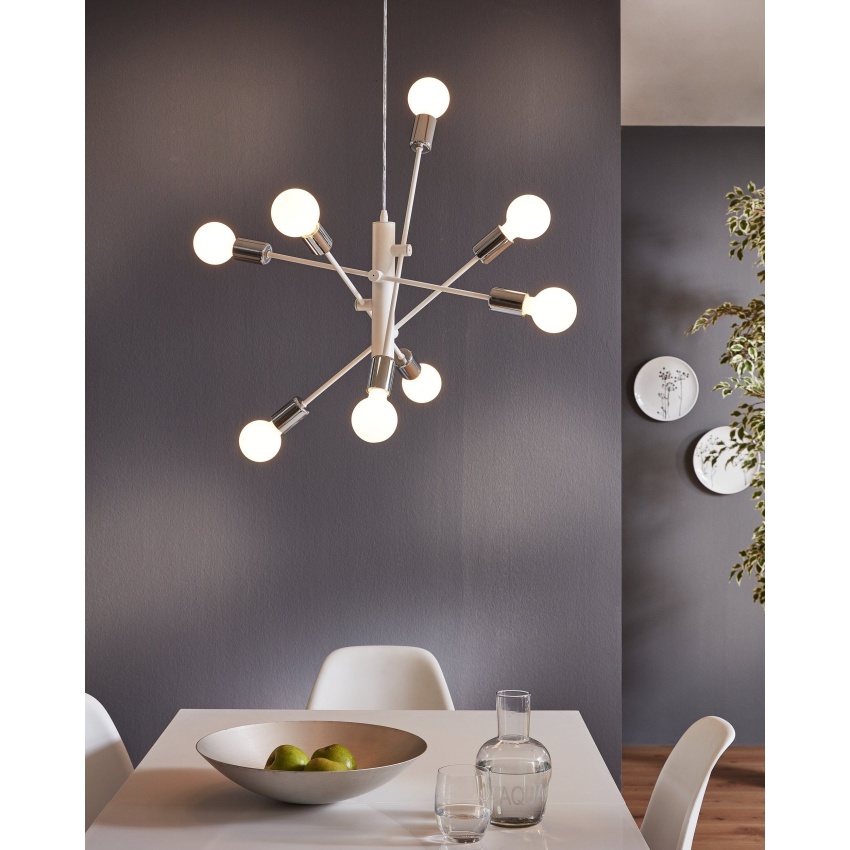 Závěsné svítidlo GRADOLI má ocelovou konstrukci v bílé barvě. Odsazená lineární ramena světel jsou nastavitelná a lze je přizpůsobit. Design starburst v kombinaci s osmi obnaženými paticemi žárovek v chromové barvě doplňuje futuristický, moderní design. Závěsné svítidlo hladce zapadne do minimalistických interiérů a poskytne výrazné osvětlení vašeho domova, ať už v obývacím pokoji nebo nad stolem v jídelně. Výrobek vyžaduje 8 žárovek E27, které nejsou součástí balení.