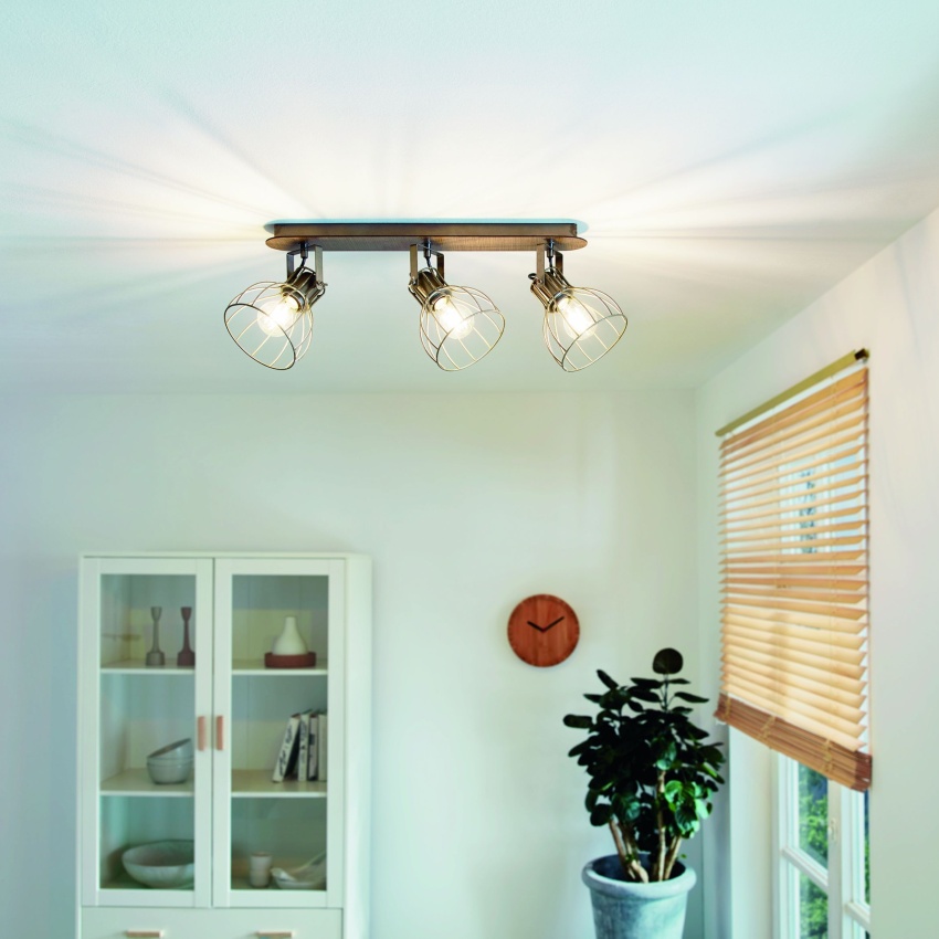 Stropní svítidlo SAMBATELLO má podlouhlý design se stříbrným povrchem a panelem s povrchovou úpravou dřeva. K tělu jsou připevněny tři nastavitelné drátěné reflektory, které při rozsvíceném světle vytvářejí fascinující hru světla a stínu. Stropní bodové svítidlo doplňuje interiéry v industriálním stylu a svými výkyvnými hlavami poskytuje soustředěné osvětlení, ať už v kuchyni, obývacím pokoji, ložnici nebo chodbě. Vyobrazené žárovky s vláknem nejsou součástí dodávky. Výrobek má objímky žárovek E27 a vyžaduje žárovky E27.