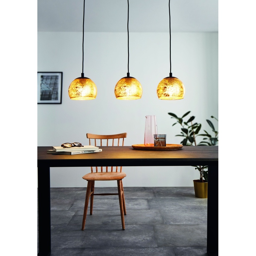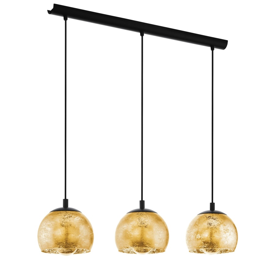 Závěsné svítidlo ALBARACCIN má tři sférická skleněná stínidla s povrchovou úpravou ve stylu zlatého listu. Tři skleněná stínidla jsou zavěšena na černých textilních kabelech připevněných k podlouhlému černému kovovému vrchlíku. Elegantní závěsné svítidlo má jednoduchý design a skvěle doplňuje moderní interiéry a poskytuje stylové osvětlení v obývacím pokoji nebo jídelně nad jídelním stolem. Žárovky nejsou součástí dodávky. Výrobek má objímky žárovek E27 a vyžaduje 3 žárovky E27.