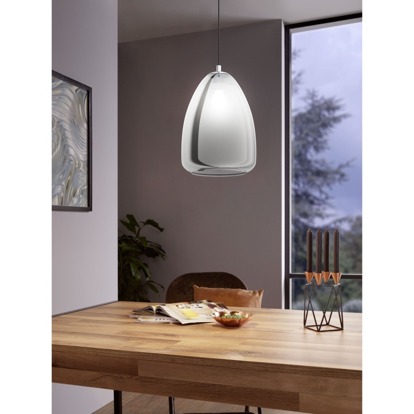 Závěsné svítidlo ALOBRASE má zaoblené stínidlo z černého kouřového skla, které je zavěšeno černým kabelem na kruhovém kovovém krytu v chromové barvě. S průměrem 30 cm se svým designem hodí téměř do každého moderního interiéru. Trendové závěsné svítidlo poskytuje stylové osvětlení vašeho prostoru, ať už v obývacím pokoji nebo nad stolem v jídelně. Vyobrazená žárovka s vláknem není součástí balení. Výrobek má objímku žárovky E27 a vyžaduje žárovku E27.