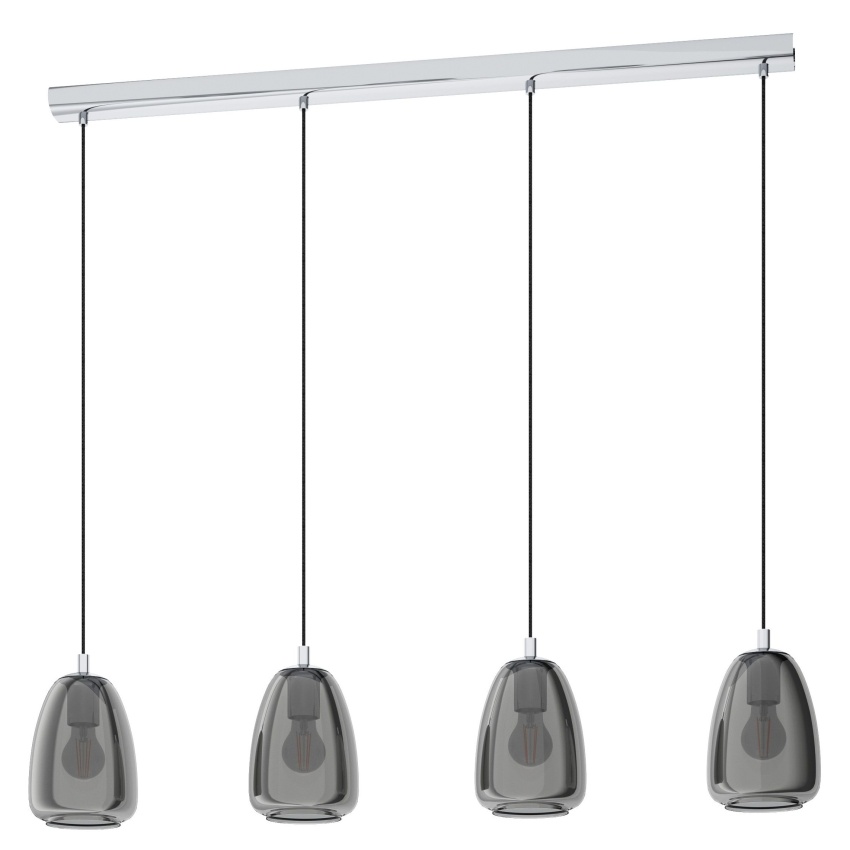 Závěsné svítidlo ALOBRASE se vyznačuje čtyřmi zaoblenými stínidly z kouřově černého skla, která jsou zavěšena černými kabely na podlouhlém kovovém krytu v barvě chromu. Svým designem se hodí téměř do každého moderního interiéru. Trendové závěsné svítidlo poskytuje stylové osvětlení vašeho prostoru, ať už v obývacím pokoji nebo nad stolem v jídelně. Vyobrazené žárovky s vláknem nejsou součástí dodávky. Výrobek má objímky žárovek E27 a vyžaduje žárovky E27.