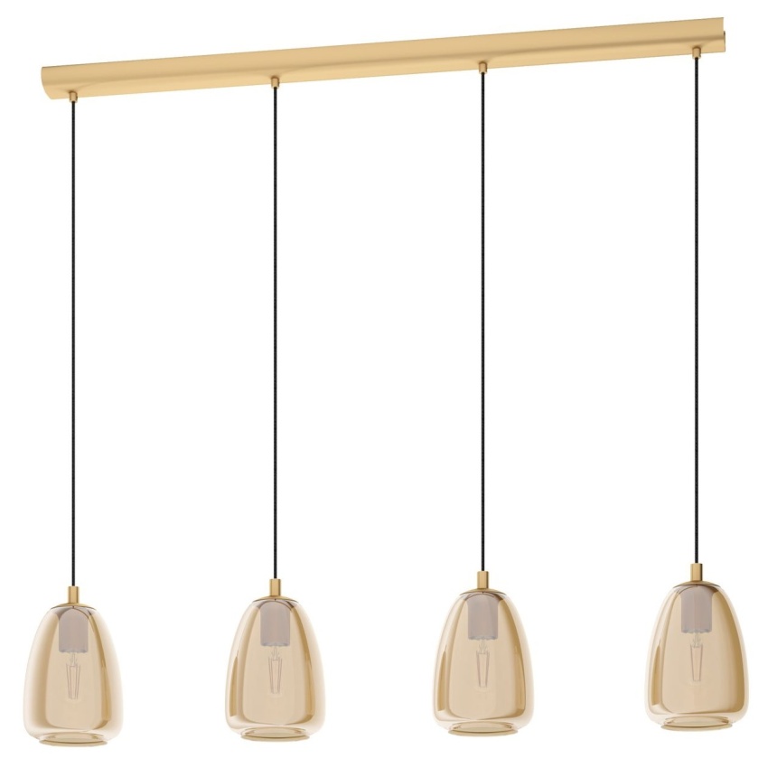 Závěsné svítidlo ALOBRASE má čtyři zaoblená stínidla z kouřového skla v jantarové barvě, zavěšená na černých kabelech z podlouhlého kovového vrchlíku v povrchové úpravě broušená mosaz. Design se hodí téměř do každého moderního interiéru. Trendové závěsné svítidlo poskytuje stylové osvětlení vašeho prostoru, ať už v obývacím pokoji nebo nad stolem v jídelně. Vyobrazené žárovky s vláknem nejsou součástí dodávky. Výrobek má objímky žárovek E27 a vyžaduje žárovky E27.