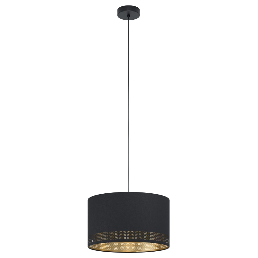 Závěsné svítidlo ESTEPERRA je vyrobeno z černého kovu a má kulaté stínidlo z černé látky s vnitřní zlatou podšívkou. Malé výřezy kolem okraje stínidla vytvářejí fascinující hru světla a stínu, jakmile se rozsvítí světlo. Závěsné svítidlo se hodí téměř do každého domácího interiéru a poskytuje stylové osvětlení jakéhokoli prostoru, ať už v obývacím pokoji nebo nad jídelním stolem. Výrobek vyžaduje 1 žárovku E27, která není součástí balení.