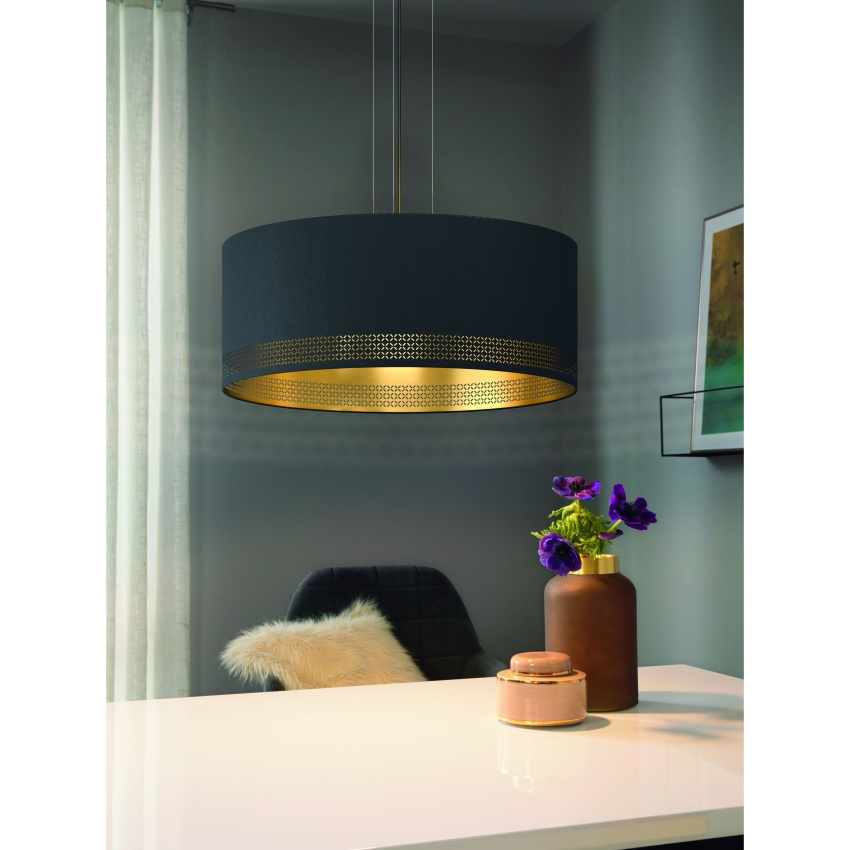 Stropní svítidlo ESTEPERRA je vyrobeno z černého kovu a má kulaté stínidlo z černé látky s vnitřní zlatou podšívkou. Malé výřezy kolem okraje stínidla vytvářejí fascinující hru světla a stínu, jakmile se rozsvítí světlo. Stropní svítidlo splyne s téměř jakýmkoli domácím interiérem a poskytuje stylové osvětlení jakéhokoli prostoru, ať už v obývacím pokoji, jídelně nebo ložnici. Výrobek vyžaduje 1 žárovku E27, která není součástí balení.