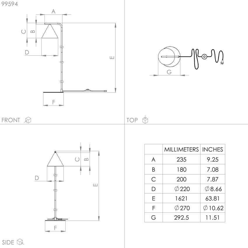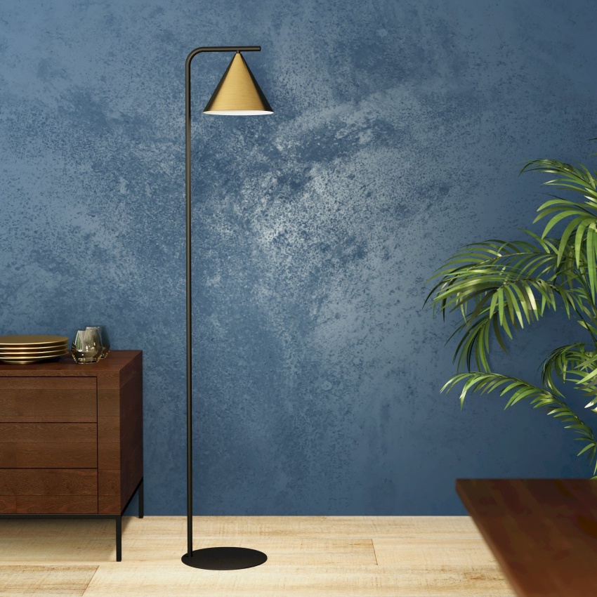 Stojací lampa NARICES má zakřivenou černou kovovou základnu s kónickým stínidlem vyrobeným z broušeného mosazného kovu v mosazném provedení. Stínidlo má zlatý vnitřní povrch, který dokonale doplňuje nový severský styl světla. Světlo lze snadno zapínat a vypínat pomocí řadového podlahového spínače. Výrobek má minimalistický lineární design, který poskytuje stylové osvětlení v obývacím pokoji, ložnici nebo jídelně. Žárovka není součástí dodávky. Výrobek má objímku žárovky E27 a vyžaduje žárovku E27.