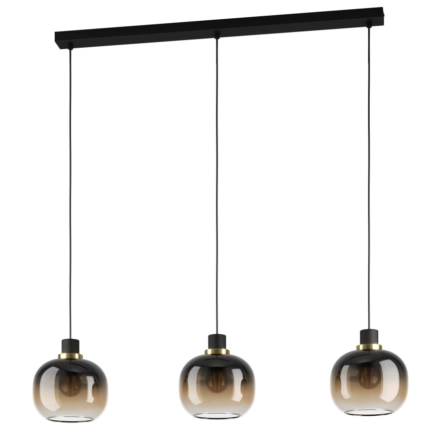 Závěsné svítidlo OILELLA se vyznačuje třemi kulovými skleněnými stínidly v atraktivním černém a hnědém barevném provedení. Každé stínidlo má černý kovový akcent a ozdobný prvek z broušené mosazi. Vzhledem k lákavým zemitým tónům design krásně rozzáří váš prostor, ať už v obývacím pokoji nebo nad dlouhým stolem v jídelně. Vyobrazené žárovky s vláknem nejsou součástí dodávky. Výrobek má objímky žárovek E27 a vyžaduje žárovky E27.