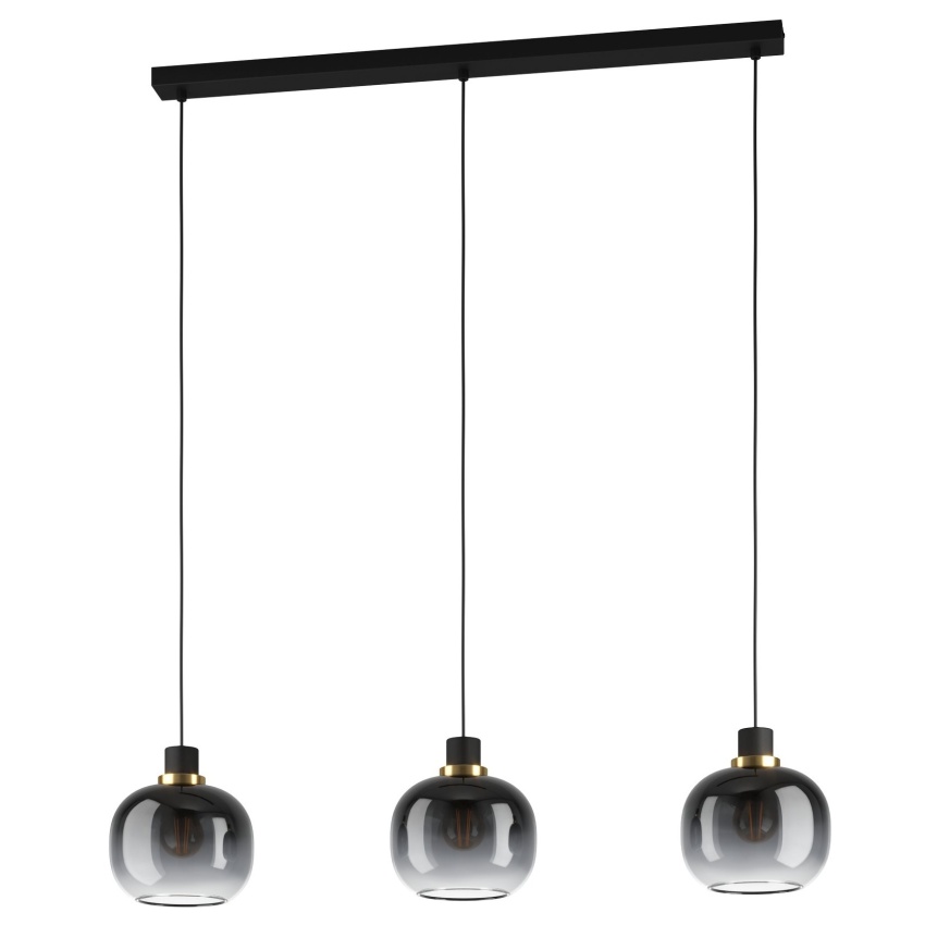 Závěsné svítidlo OILELLA se vyznačuje třemi kulovými skleněnými stínidly v atraktivním černém a šedém barevném provedení. Každé stínidlo má černý kovový akcent a ozdobný prvek z broušené mosazi. Závěsné svítidlo svými přitažlivými tóny krásně rozzáří váš prostor, ať už v obývacím pokoji nebo nad dlouhým stolem v jídelně. Vyobrazené žárovky s vláknem nejsou součástí dodávky. Výrobek má objímky žárovek E27 a vyžaduje žárovky E27.