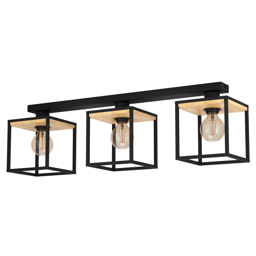 Stropní svítidlo LIBERTAD má tři obdélníkové černé kovové rámy s ozdobným panelem z kaučukovníku na každém stínítku. Odkryté držáky lamp uvnitř zvýrazňují minimalistický vzhled. Stropní svítidlo se prolíná s širokou škálou trendů interiérového designu a poskytuje moderní osvětlení v obývacím pokoji, ložnici nebo chodbě. Vyobrazené žárovky s vláknem nejsou součástí dodávky. Výrobek má objímky žárovek E27 a vyžaduje žárovky E27.