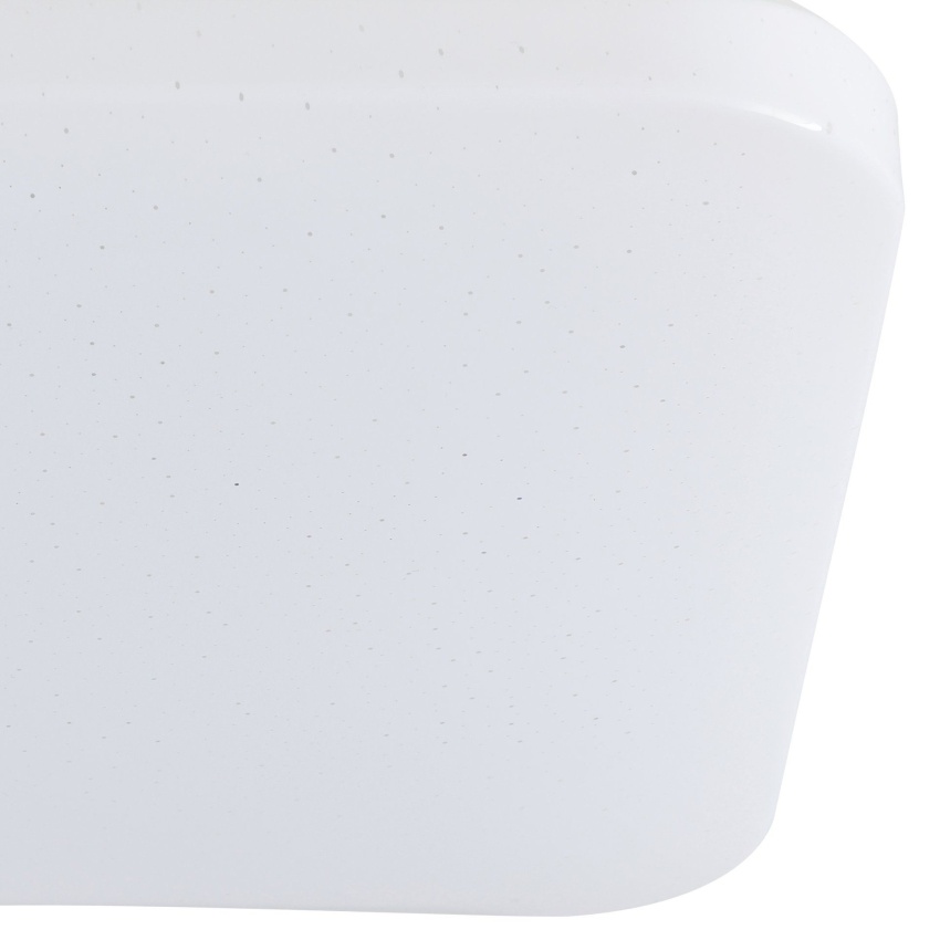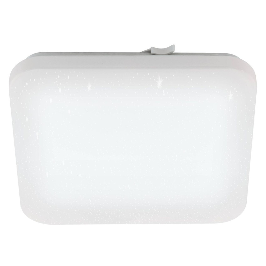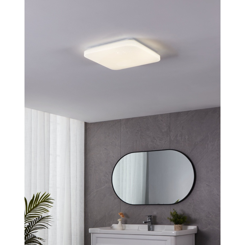 Stropní LED svítidlo FRANIA-S má čtvercový bílý plastový kryt se zaoblenými rohy a bílý kovový zadní panel. Když je světlo zapnuté, svítí skrz kryt a vytváří jiskřivý efekt jako hvězdy na noční obloze, když se pohybuje. Výrobek je vhodný pro použití v koupelně díky krytí IP44 proti stříkající vodě. Integrované LED diody vytvářejí jasné neutrální bílé světlo. Stropní svítidlo má rozměry 33 x 33 cm a dokonale zapadne do moderních interiérů. Výrobek poskytuje jednoduché, ale výrazné osvětlení vhodné do každého prostoru, který potřebuje dobře osvětlit, jako je koupelna, kuchyň nebo chodba.