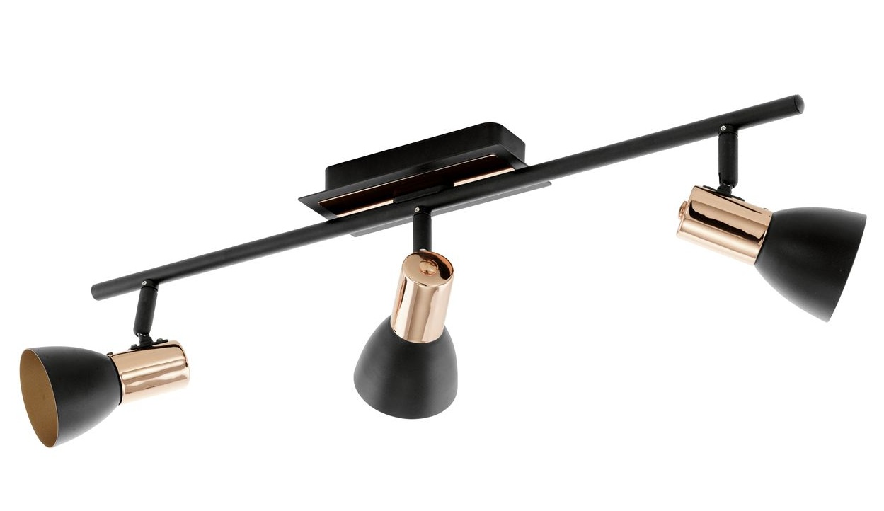 Stropní LED svítidlo BARNHAM má lineární kovové tělo v černé barvě spárované s měděnou dekorativní deskou. Měděné konce tří černých reflektorů dodávají designu dokonalý nádech. Nastavitelná stínidla mají také měděné vnitřní plochy, které vrhají teplé bílé světlo, které se dokáže zaměřit na konkrétní oblasti. Stropní bodové svítidlo svým moderním designem nabízí ideální řešení osvětlení místností jako je kuchyně, obývací pokoj, ložnice nebo chodba. Dodává se s LED žárovkami GU10.