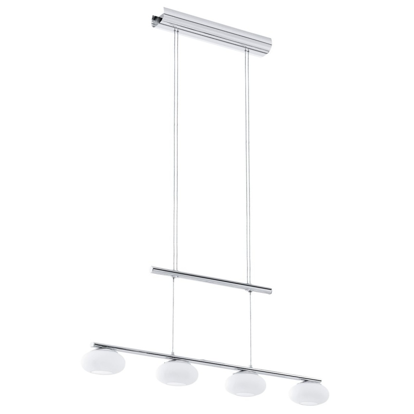Závěsné svítidlo ALEANDRO 1 má kovový stropní držák v chromové barvě se čtyřmi kulatými stínidly vyrobenými z matného opálového skla v bílé barvě. Integrované LED diody vytvářejí příjemné teplé bílé světlo a lze je stmívat pomocí koordinačního otočného stmívače na stěně. Závěsné svítidlo je výškově nastavitelné a skvěle doplňuje moderní interiéry a poskytuje dokonalé osvětlení dlouhého jídelního stolu.