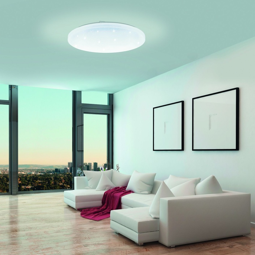 Stropní LED svítidlo FRANIA-A z řady Access na dálkové ovládání má kulatý bílý plastový kryt a bílou kovovou základnu. Když je světlo zapnuté, vytváří jiskřivý efekt jako hvězdy na noční obloze. Integrované LED diody vytvářejí příjemné světlo, které lze nastavit podle potřeby. Můžete si vybrat mezi teplým bílým, neutrálním bílým a studeným bílým světlem. Světlo lze ovládat pomocí přiloženého dálkového ovladače, který nabízí i další funkce, jako je nastavení jasu, noční světlo a časovač (který se vypne po 30 minutách), plus dva přednastavené režimy svícení. Dálkovým ovladačem můžete také ovládat až osm světel Access současně a uložit vlastní nastavení osvětlení. Výrobek je vhodný pro použití v koupelně díky krytí IP44 proti stříkající vodě. Stropní svítidlo s průměrem 30 cm plynule splyne s moderními a minimalistickými interiéry a poskytuje stylové osvětlení jakéhokoli prostoru, ať už v koupelně, kuchyni nebo předsíni.