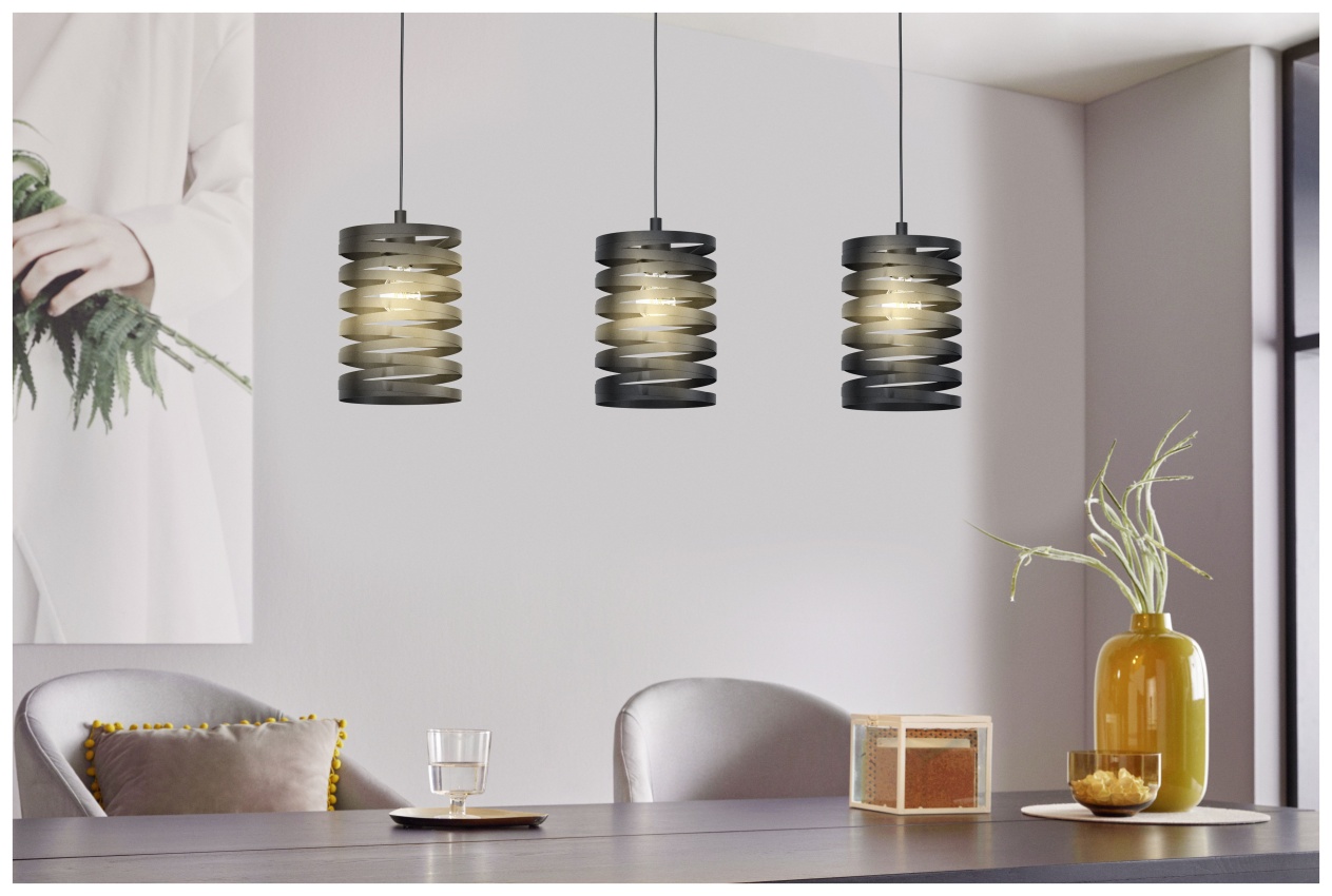 Závěsné svítidlo CREMELLA má tři válcová stínidla vyrobená z černého kovu. Spirálové kovové pásy vytvářejí fascinující hru světla a stínu, jakmile se rozsvítí světlo. Závěsné svítidlo hladce splyne s trendy, jako je vintage a industrial. Výrobek nabízí moderní design pro jakýkoli prostor, ať už v kuchyni, obývacím pokoji nebo jídelně nad dlouhým stolem. Výrobek vyžaduje 3 x E27 žárovky, které nejsou součástí balení.