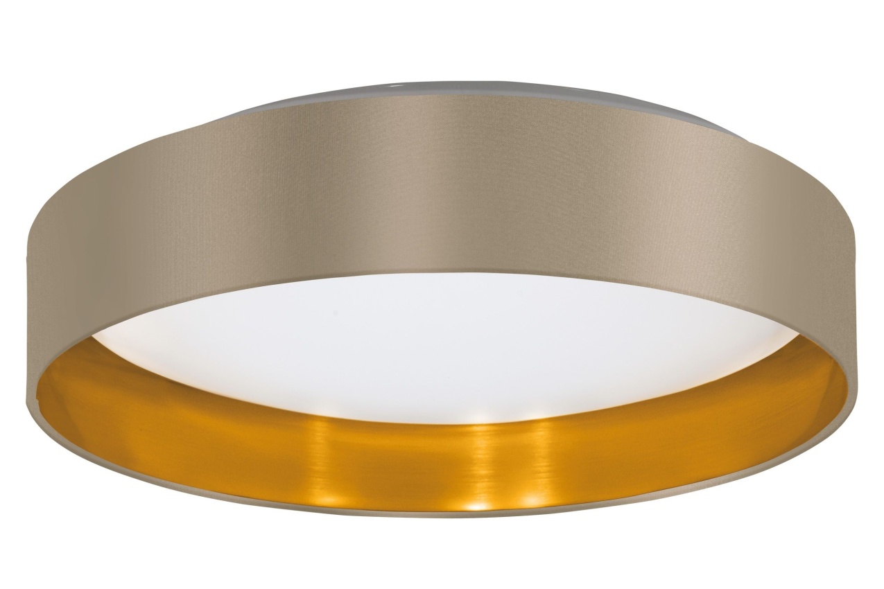 Stropní svítidlo MASERLO 2 LED má kulaté stínidlo z látky cappuccino a zlatý vnitřní povrch. Svým tvarem a bílým plastovým krytem vytváří jednotné teplé bílé osvětlení. Stropní svítidlo se skvěle hodí do moderních a minimalistických interiérů. Výrobek poskytuje útulné osvětlení jakéhokoli prostoru, ať už v obývacím pokoji, ložnici, chodbě nebo jídelně.
