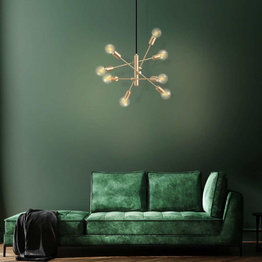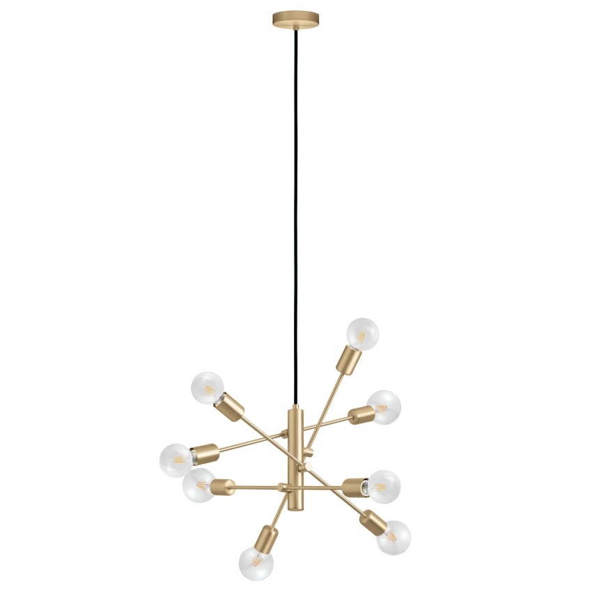 Závěsné svítidlo GRADOLI 1 má ocelovou konstrukci s povrchovou úpravou z kartáčované mosazi. Odsazená, lineární ramena světel jsou nastavitelná a lze je nastavit. Starburst design v kombinaci s osmi odhalenými objímkami žárovek a černým textilním kabelem doplňuje elegantní, futuristický design. Závěsné svítidlo hladce zapadne do moderních interiérů a vytvoří prvek v každém prostoru, ať už v obývacím pokoji nebo nad stolem v jídelně. Výrobek vyžaduje 8 žárovek E27, které nejsou součástí balení.