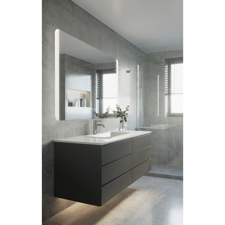 Zrcadlo BUENAVISTA 2 LED má čisté linie v podobě dvou vertikálních difuzorů světla se saténovým povrchem a krásně zapadne do moderních koupelen. Obdélníkové zrcadlo má zaoblené rohy a je připevněno ke stěně pomocí stříbrného hliníkového držáku, který poskytuje plovoucí efekt. LED diody obklopující držák poskytují nepřímé osvětlení na stěně a lze je přepínat mezi teplou bílou, neutrální bílou a studenou bílou, zatímco saténový zrcadlový difuzor světla vytváří jasné osvětlení. Neutrální bílé světlo poskytuje příjemné osvětlení pro vaši každodenní péči. Zrcátko lze zapnout a vypnout dotykem zóny „dotkněte se mě“. Dodatečná funkce proti zamlžování zabraňuje zamlžování zrcadla a zajišťuje, že zůstane reflexní, když je sprcha zapnutá. S krytím IP44 proti stříkající vodě je vhodný pro použití v koupelně.