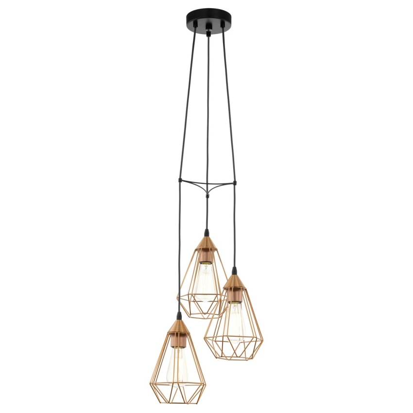 Závěsné svítidlo TARBES má tři drátěná stínidla měděné barvy v jemném kosočtverečném tvaru zavěšená v různých výškách na kulatém černém vrchlíku. Když je světlo zapnuté, vytváří fascinující hru světla a stínu prostřednictvím geometrického designu. Ať už v obývacím pokoji nebo nad jídelním stolem, moderní závěsné svítidlo poskytuje stylové osvětlení jakéhokoli prostoru. Vyobrazené žárovky s vláknem nejsou součástí dodávky. Výrobek má objímky žárovek E27 a vyžaduje žárovky E27.