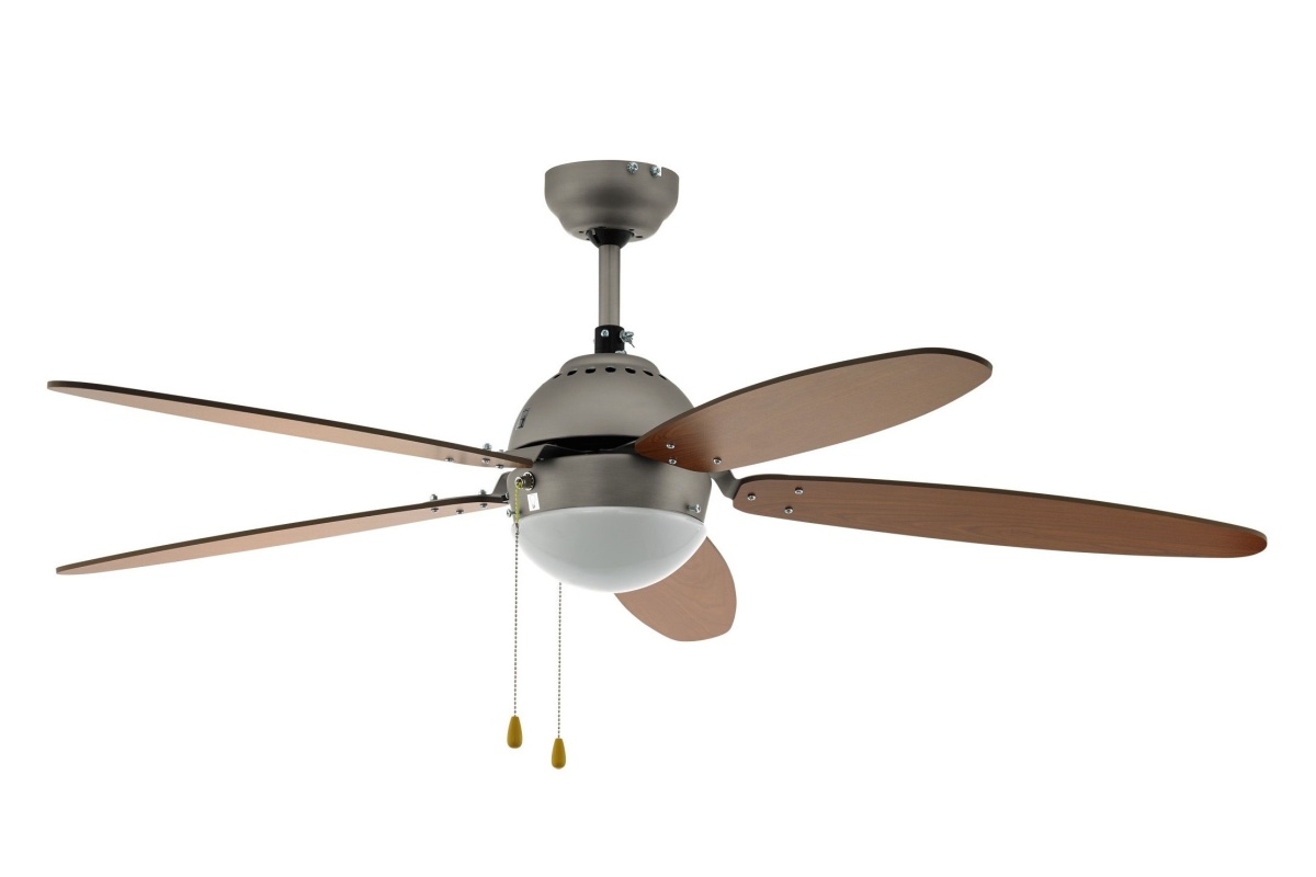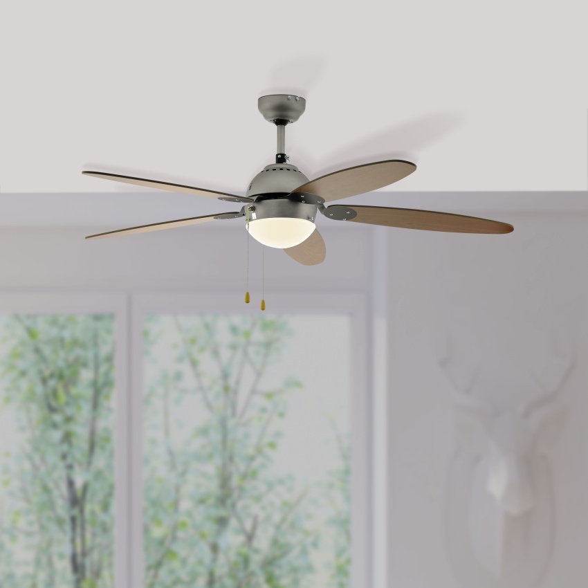 Stropní ventilátor SUSALE se světlem má matný niklový povrch a pět MDF lopatek. Lopatky stropního ventilátoru jsou oboustranné, takže je vidět červenohnědá strana nebo strana s efektem světle hnědého dřeva. Stropní ventilátor má kulaté stínidlo z bílého skla. Stahovací šňůrky zapínají a vypínají světlo a volí jednu ze tří rychlostí a nechybí ani možnost přepínání mezi letním a zimním režimem. Směr otáčení je reverzibilní (letní a zimní režim), takže ventilátor slouží celoročně k udržení příjemné teploty v místnosti. Tento klasický stropní ventilátor má vestavěný AC motor a poměr proudění vzduchu k výkonu 2,61 (m?/min)/W. S průměrem 132 cm je výrobek ideální pro místnosti o velikosti od 20 do 27 m2. Výrobek lze namontovat na stropy, které se svažují pod úhlem až 15°. Výrobek má objímku žárovky E14 a vyžaduje žárovku E14, která není součástí balení.