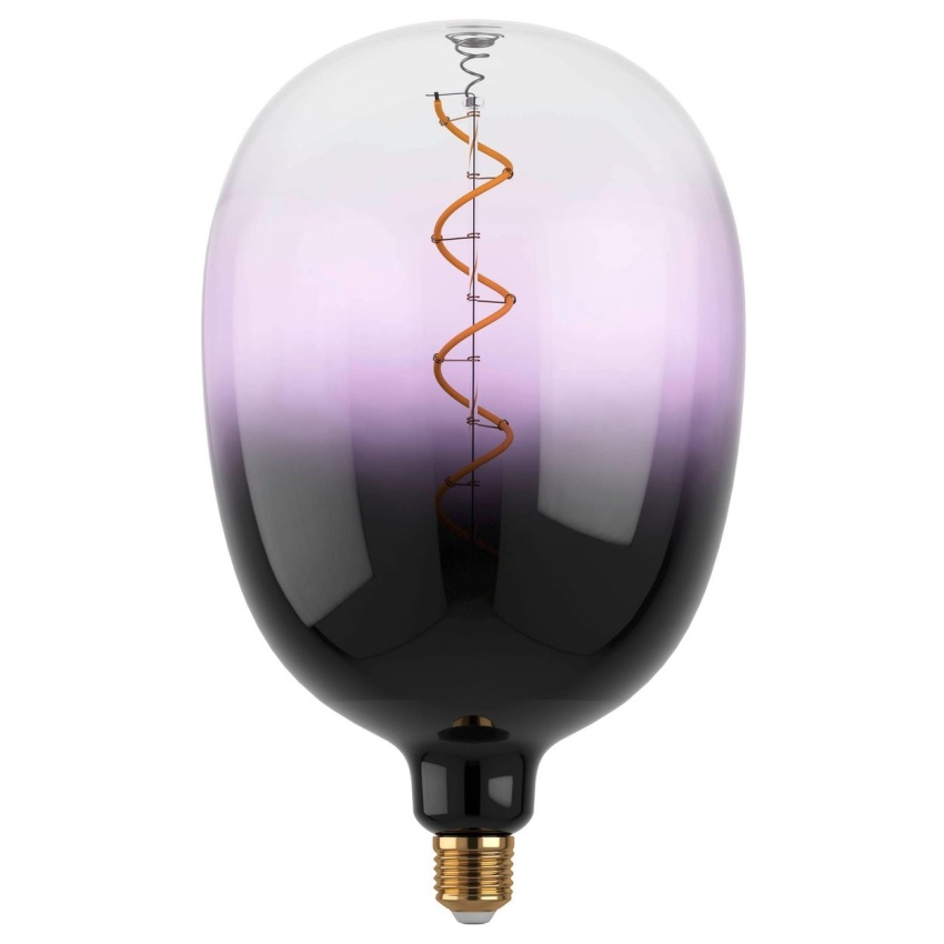 Nadměrná dekorativní LED žárovka E27 (velká) má povrch z potaženého skla s atraktivním barevným přechodem, který přechází z fialové na černou. LED diody ve tvaru spirály skvěle doplňují výrazný design. LED žárovka (T180) vytváří příjemné teplé bílé světlo a lze ji stmívat (v závislosti na funkcích stmívání vašeho světla). Díky extra velkému tvaru produkt perfektně funguje jako samostatná dekorativní žárovka a vytváří poutavý prvek v každém obytném prostoru.