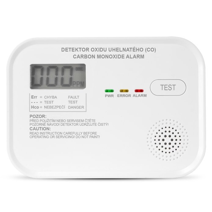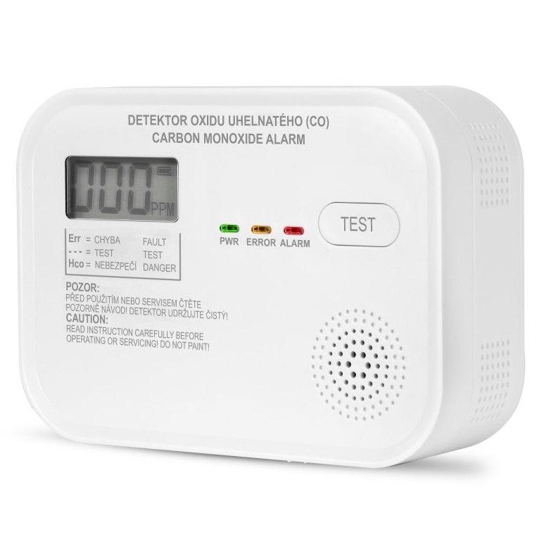 Displej poskytuje informace o koncentraci CO, stav baterie a upozorňuje i na nízkou koncentraci CO (30 PPM) během 40 minut.