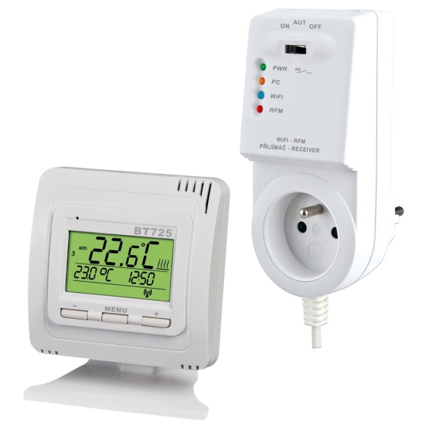 Přenosný vysílač s elegantním stojánkem. V přijímači je implementovaný WiFi modul s interní anténou. Je vhodný ke všem kotlům, které vyžadují bezpotencionální (beznapěťové) spínací kontakty (např. plynové kotle, elektro - kotle, oběhová čerpadla, termoelektrické pohony nebo klimatizační jednotky).