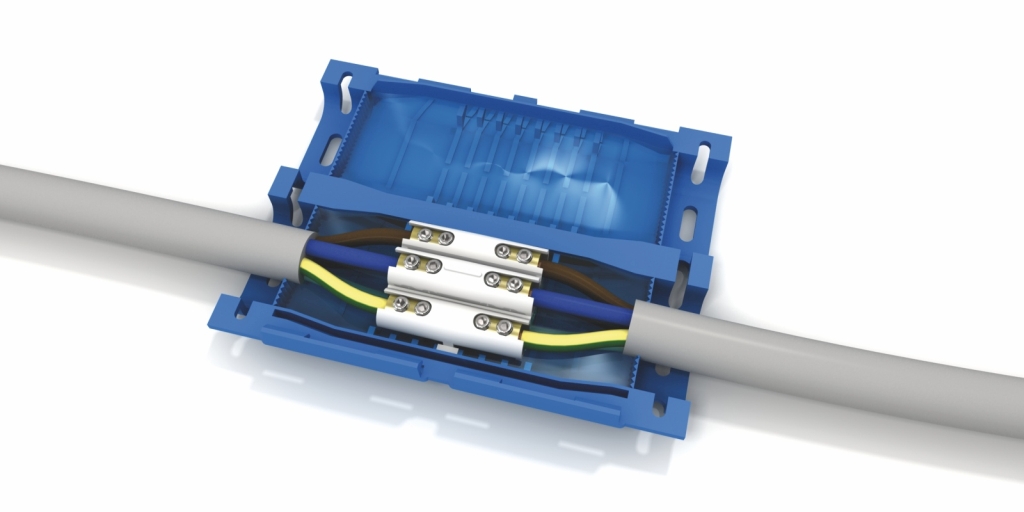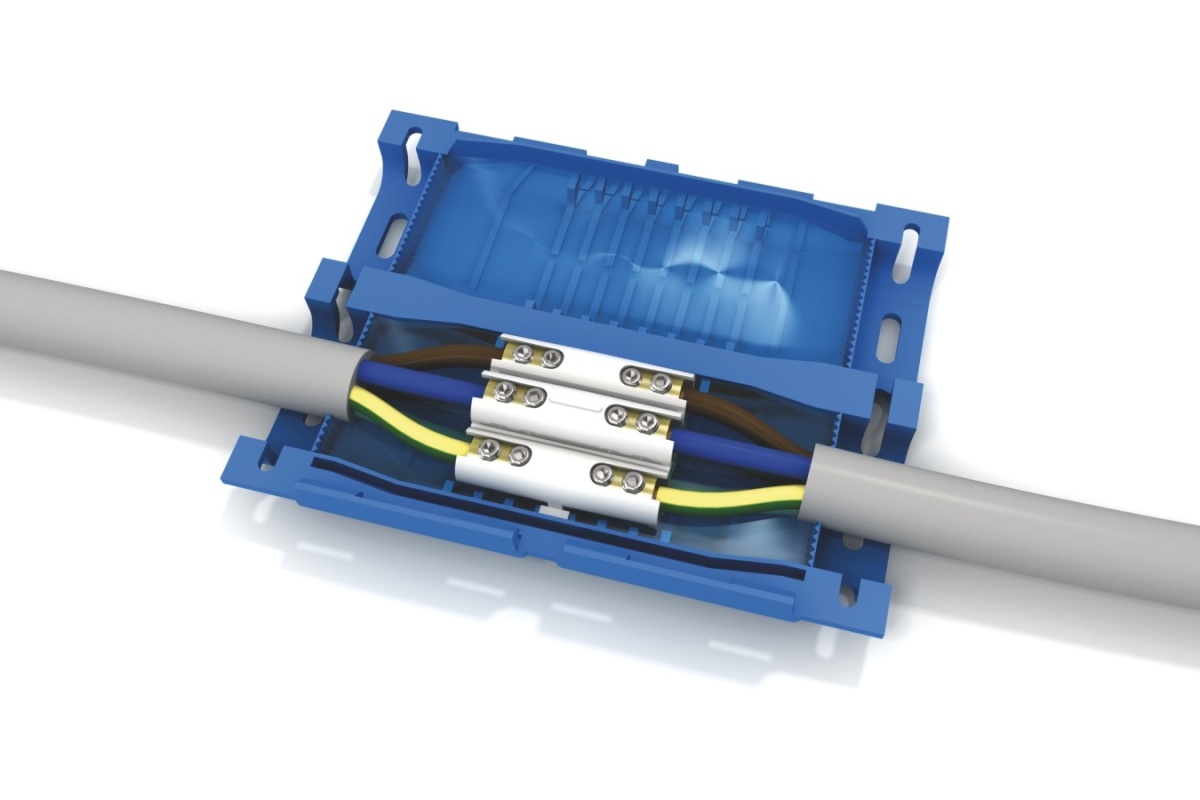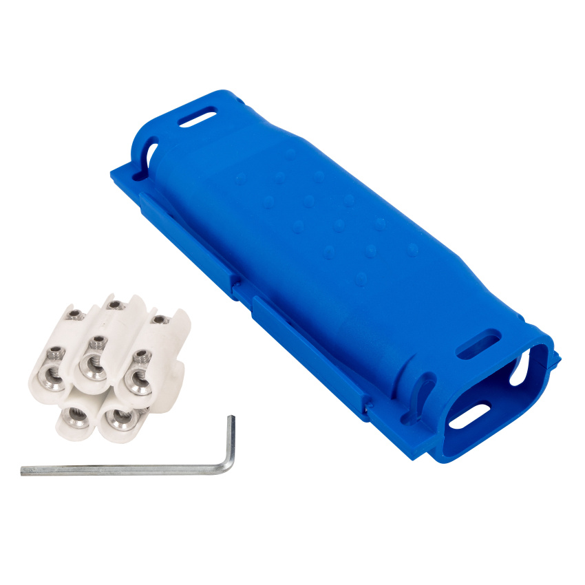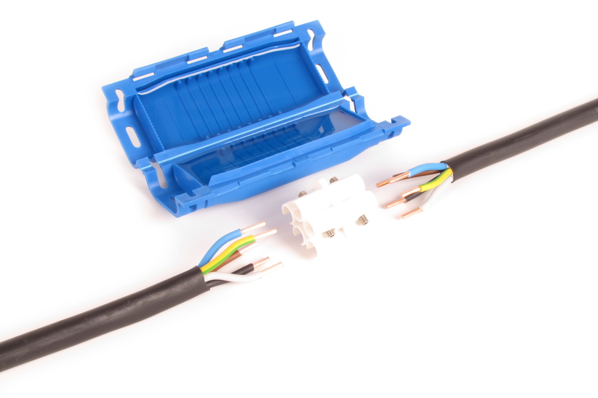 Kabelová spojka SHARK 506 GEL-gelová pro vodiče: spojení přímé - prům. 3-5x1,5-6 mm2, spojení odbočné: 3-5x1,5-6 mm2 (hlavní kabel) + 3-5x1,5-2,5 mm2 (odbočný kabel), součástí balení je svorkovnice, imbusový klíč pro svorkovnici a 2 stahovací pásky, EN 50393.