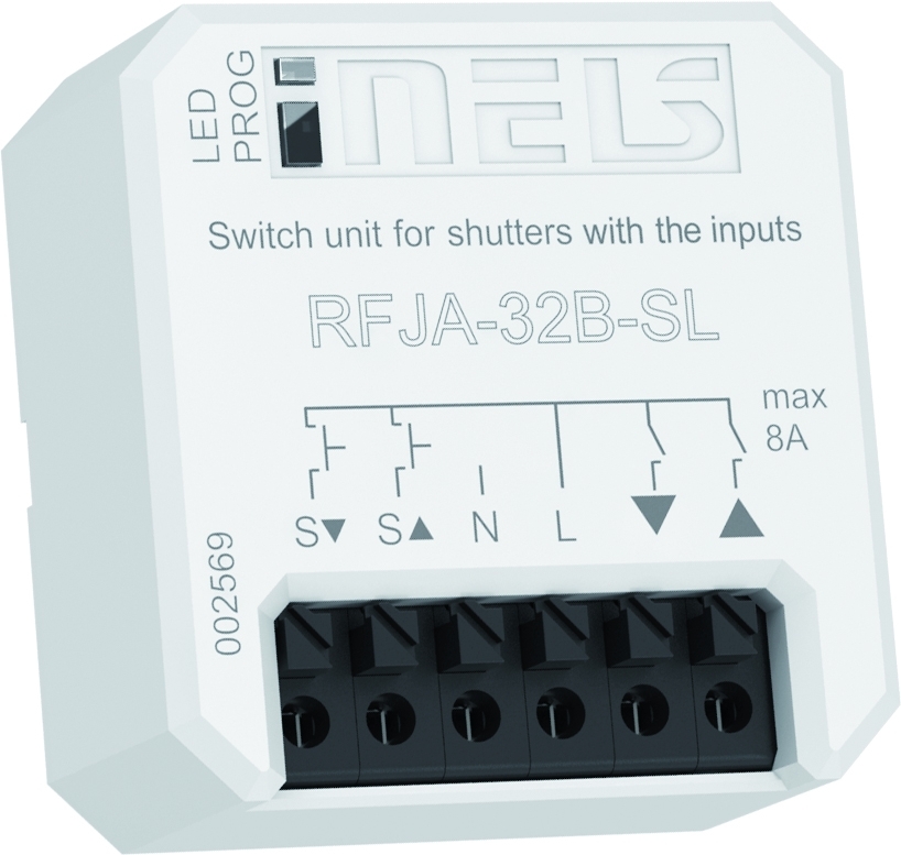 Spínací prvek pro žaluzie má 2 výstupní kanály sloužící k ovládání garážových vrat, bran, žaluzií, markýz… Lze je kombinovat s Ovladači nebo Systémovými prvky iNELS RF Control. Provedení BOX nabízí montáž přímo do instalační krabice, podhledu nebo krytu pohonu motoru. RFJA-32B/230V: připojení spínané zátěže 2x 8 A (2x 2000 W), s možností připojení stávajících drátových tlačítek. Krátké stisky ovladače umožnují naklápění lamel, dlouhý stisk vytažení / zatažení žaluzií do koncové polohy. Každý prvek může být ovládán až 25 kanály (1 kanál představuje jeden přiřazený ovladač). Programovací tlačítko na prvku slouží také jako manuální ovládání výstupu. U prvků lze nastavit funkci opakovače (repeateru) prostřednictvím servisního zařízení RFAF/USB. Dosah až 200 m (na volném prostranství), v případě nedostatečného signálu mezi ovladačem a prvkem použijte opakovač signálu RFRP-20 nebo prvky s protokolem RFIO2, které tuto funkci podporují. Komunikační frekvence s obousměrným protokolem iNELS RF Control2 (RFIO2). Materiál kontaktu relé AgSnO2.