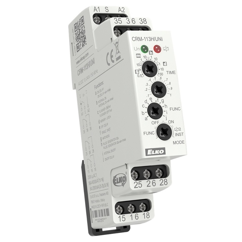 • multifunkční časové relé pro univerzální využití v automatizaci, řízení a regulaci nebo v domovních instalacích • všechny funkce iniciované napájecím napětím, mimo funkci blikače, mohou využít ovládací vstup k potlačení zpoždění (pauza) • volba režimu relé – podle nastavené funkce, trvale sepnuto, trvale rozepnuto, funkce impulzního relé se zpožděním (CRM-111H) / spínání druhého relé dle napájecího napětí (CRM-113H) • univerzální napájecí napětí AC/DC 12 – 240 V • nastavitelný čas od 50 ms do 30 dní je rozdělen do 10-ti rozsahů: (50 ms - 0.5 s / 0.1 s - 1 s / 1 s - 10 s / 0.1 min - 1 min / 1 min - 10 min / 0.1 hod - 1 hod / 1 hod - 10 hod / 0.1 den - 1 den / 1 den - 10 dní / 3 dny - 30 dní) • výstupní kontakt: CRM-111H: 1x přepínací 16 A CRM-113H: 1x přepínací 16 A, 2x přepínací 8 A • multifunkční červená LED bliká nebo svítí v závislosti na provozním stavu