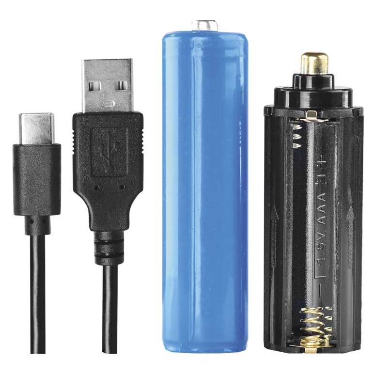 příslušenství: Li-Ion baterie, držák na 3x AAA, USB-C Kabel, plastová krabice