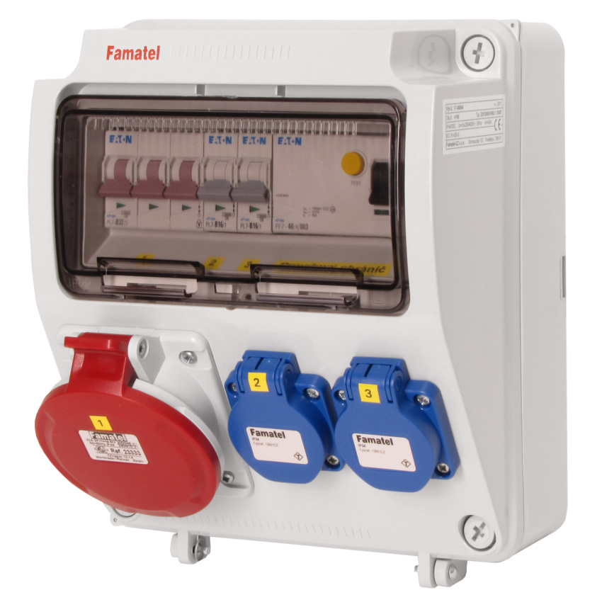 Zásuvková skříň (rozváděč nízkého napětí) FAMATEL v190-ZSF20001000.1 /3957 IP54 jištěná s chráničem 40/4/003, zásuvky 2x230V/16A (s ochranným kolíkem dle ČSN), 1x400V/32A/5pól, jistící přístroje EATON 10kA: 2xPL7-B16/1, 1xPL7-B32/3, PF7-40/4/003 na vstupu (citlivost na reziduální proud 30mA), použité pouzdro: 3957 - celkem k dispozici 9mod. míst, rozměry: 245x215x155mm, plastová, materiál ABS, IK08, zkouška žhavou smyčkou 650°C, bezhalogenová a UV odolná, montáž na povrch, barva: světle šedá, rozsah teplot -25°C + 85°C, aplikované normy: IEC 61439-3 (Rozváděče nízkého napětí - Část 3: Rozvodnice určené k provozování laiky (DBO), balení: 1ks (fólie), zásuvky na 230V/16A s ochranným kolíkem dle ČSN, polykarbonátové okénko, jistící prvky EATON, PE svorkovnice součástí (6x16mm2), N svorkovnice součástí (6x16mm2), hladké stěny (bez prolisů) pro vyvrtání vstupního otvoru a následné osazení příslušnou vývodkou (pro CYKY 5x6; 4x10; 5x10 => M25; pro CYKY 5x16 => M32), max. připojitelný vstupní kabel = 4x25 nebo 5x16 (Cu), dodáno s průvodní dokumentací: štítkem rozváděče, návodem pro obsluhu a montáž, krycím listem (charakteristiky rozhraní), protokolem o kusové zkoušce, ES prohlášením o shodě, schématem zapojení a zkouškou oteplení pro rozváděče nízkého napětí. Pro montáž na hořlavé podklady je nutné použít nehořlavou podložku.
