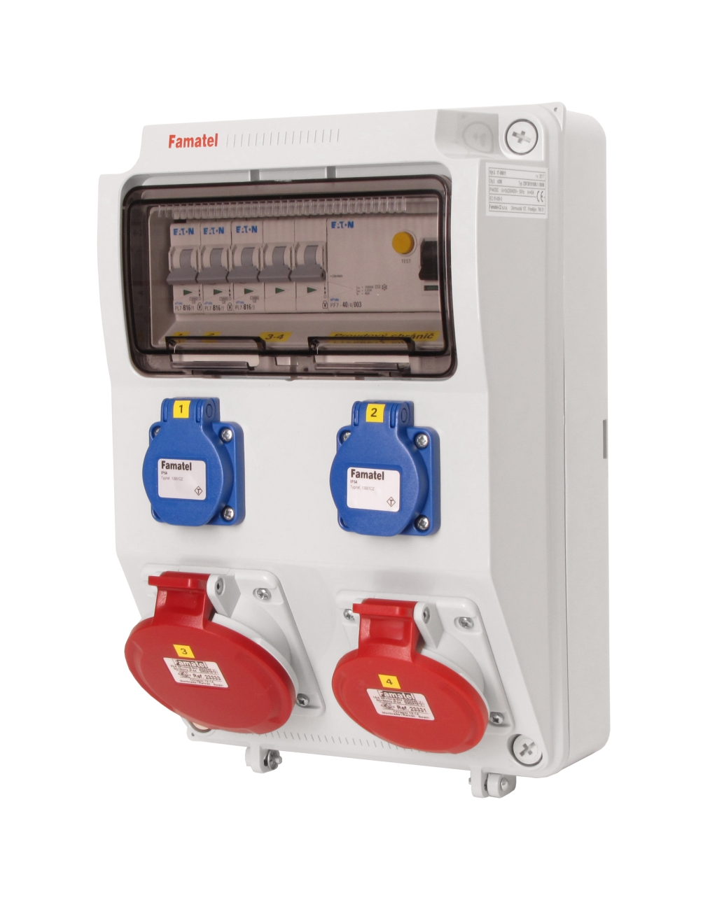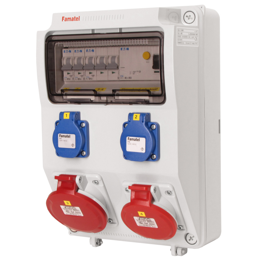 Zásuvková skříň (rozváděč nízkého napětí) FAMATEL v390-ZSF20101000.1 /3958 IP54 jištěná s chráničem 40/4/003 (ekonomická varianta), zásuvky 2x230V/16A (s ochranným kolíkem dle ČSN), 1x400V/16A/5pól, 1x400V/32A/5pól, jistící přístroje EATON 10kA: 2xPL7-B16/1, 1xPL7-B16/3 (společný pro 3fáz. zásuvky), PF7-40/4/003 na vstupu (citlivost na reziduální proud 30mA), použité pouzdro: 3958 - celkem k dispozici 9mod. míst, rozměry: 330x215x155mm, plastová, materiál ABS, IK08, zkouška žhavou smyčkou 650°C, bezhalogenová a UV odolná, montáž na povrch, barva: světle šedá, rozsah teplot -25°C + 85°C, aplikované normy: IEC 61439-3 (Rozváděče nízkého napětí - Část 3: Rozvodnice určené k provozování laiky (DBO), balení: 1ks (fólie), zásuvky na 230V/16A s ochranným kolíkem dle ČSN, polykarbonátové okénko, jistící prvky EATON, PE svorkovnice součástí (6x16mm2), N svorkovnice součástí (6x16mm2), hladké stěny (bez prolisů) pro vyvrtání vstupního otvoru a následné osazení příslušnou vývodkou (pro CYKY 5x6; 4x10; 5x10 => M25; pro CYKY 5x16 => M32), max. připojitelný vstupní kabel = 4x25 nebo 5x16 (Cu), dodáno s průvodní dokumentací: štítkem rozváděče, návodem pro obsluhu a montáž, krycím listem (charakteristiky rozhraní), protokolem o kusové zkoušce, ES prohlášením o shodě, schématem zapojení a zkouškou oteplení pro rozváděče nízkého napětí.