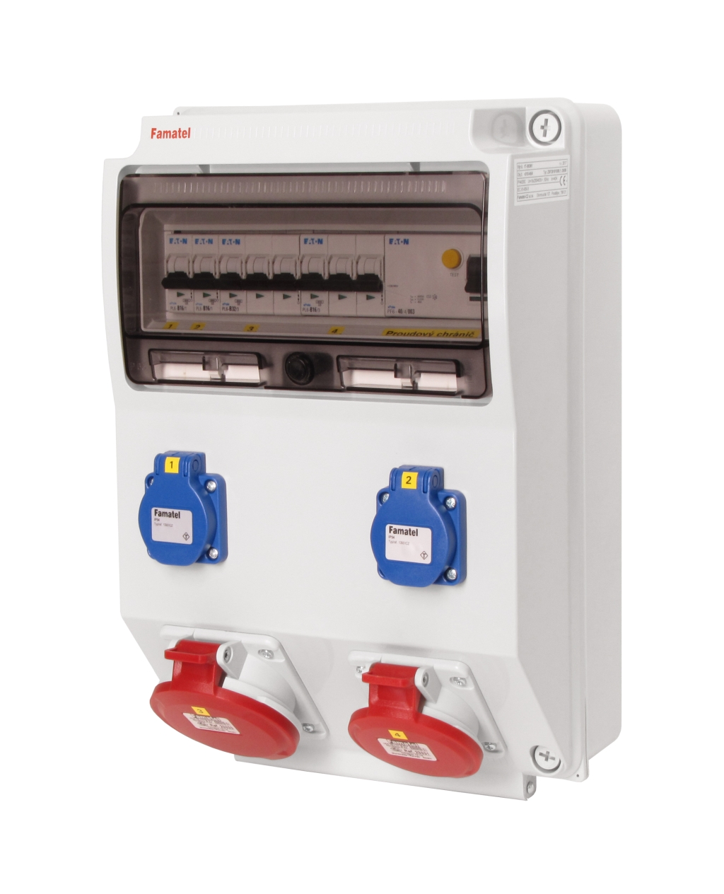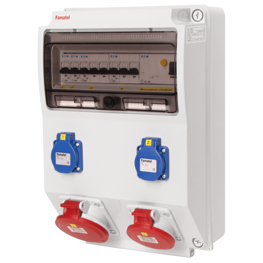 Zásuvková skříň (rozváděč nízkého napětí) v310-6kA-ZSF20101000.1 /3959 IP54 jištěná s chráničem 40/4/003, zásuvky 2x230V/16A (s ochranným kolíkem dle ČSN), 1x400V/16A/5pól, 1x400V/32A/5pól, jistící přístroje EATON 6kA: 2xPL6-B16/1, 1xPL6-B16/3, 1xPL6-B32/3, PF6-40/4/003 na vstupu (citlivost na reziduální proud 30mA), použité pouzdro: 3959 - celkem k dispozici 12mod. míst, rozměry: 398x266x153mm, plastová, materiál ABS, IK08, zkouška žhavou smyčkou 650°C, bezhalogenová a UV odolná, montáž na povrch, barva: světle šedá, rozsah teplot -25°C +85°C, aplikované normy: IEC 61439-3 (Rozváděče nízkého napětí - Část 3: Rozvodnice určené k provozování laiky (DBO), balení: 1ks (fólie), zásuvky na 230V/16A s ochranným kolíkem dle ČSN, polykarbonátové okénko, jistící prvky EATON, PE svorkovnice součástí (6x16mm2), N svorkovnice součástí (6x16mm2), stěny s předlisovanými vstupy pro vyvrtání vstupního otvoru a následné osazení příslušnou vývodkou (pro CYKY 5x6; 4x10; 5x10 => M25; pro CYKY 5x16 => M32), max. připojitelný vstupní kabel = 4x25 nebo 5x16 (Cu), dodáno s průvodní dokumentací: štítkem rozváděče, návodem pro obsluhu a montáž, krycím listem (charakteristiky rozhraní), protokolem o kusové zkoušce, ES prohlášením o shodě, schématem zapojení a zkouškou oteplení pro rozváděče nízkého napětí. Pro montáž na hořlavé podklady je nutné použít nehořlavou podložku.