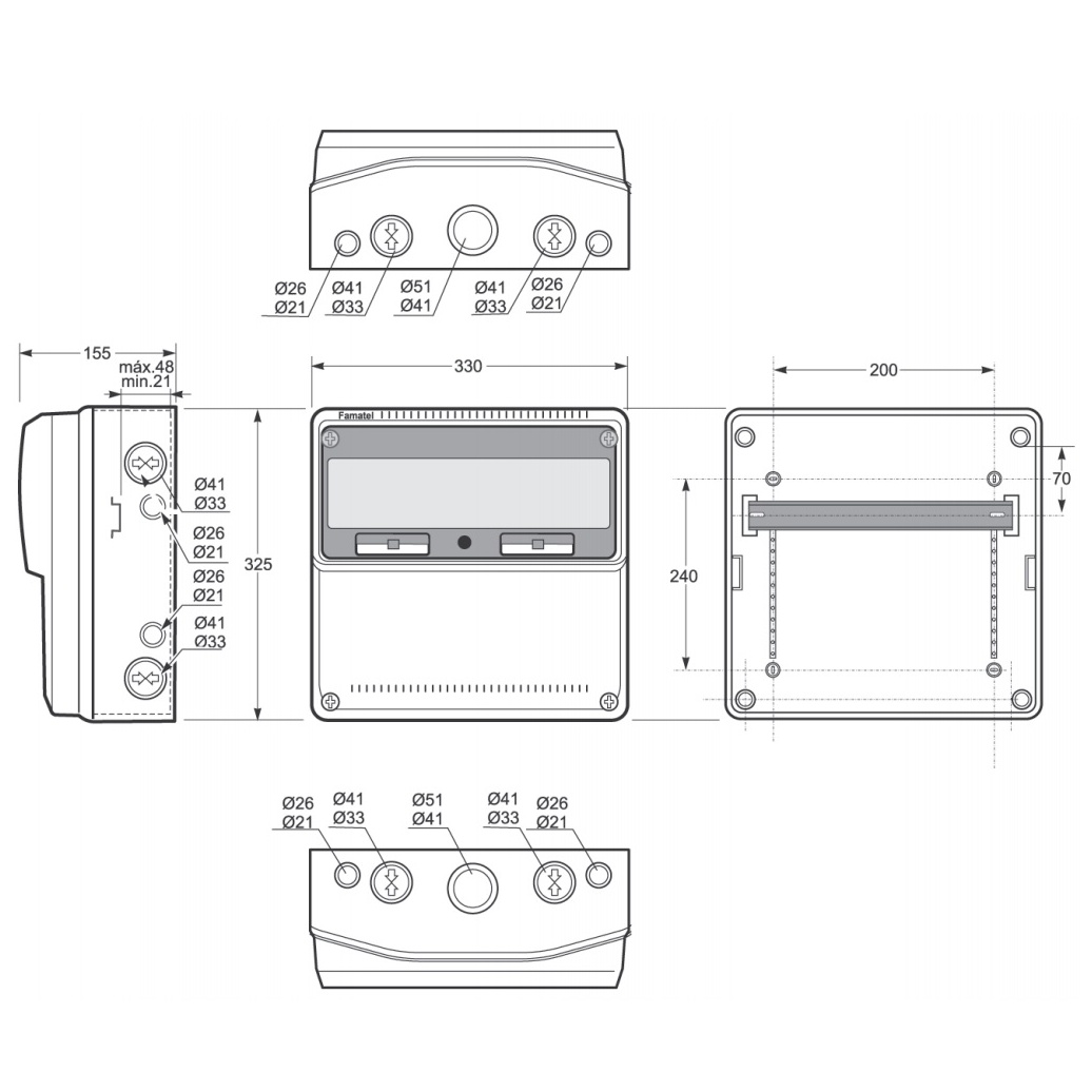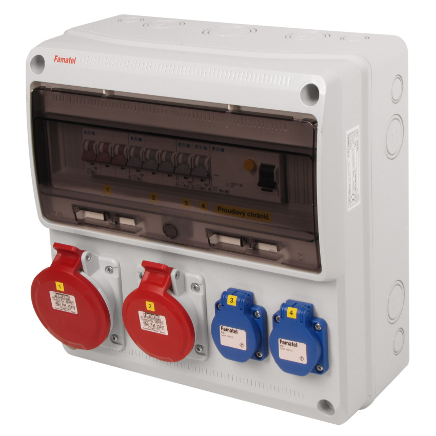 Zásuvková skříň (rozváděč nízkého napětí) v598-ZSF20101000.1 /3974 IP54 jištěná s chráničem 40/4/003, zásuvky 2x230V/16A (s ochranným kolíkem dle ČSN), 1x400V/16A/5pól, 1x400V/32A/5pól , jistící přístroje EATON 10kA: 2xPL7-B16/1, 1xPL7-B16/3, 1xPL7-B32/3, PF7-40/4/003 na vstupu (citlivost na reziduální proud 30mA), použité pouzdro: 3974 - celkem k dispozici 16mod. míst, rozměry: 330x330x155mm, plastová, materiál ABS, IK08, zkouška žhavou smyčkou 650°C, bezhalogenová a UV odolná, montáž na povrch, barva: světle šedá, rozsah teplot -25°C +85°C, aplikované normy: IEC 61439-3 (Rozváděče nízkého napětí - Část 3: Rozvodnice určené k provozování laiky (DBO), balení: 1ks (fólie), zásuvky na 230V/16A s ochranným kolíkem dle ČSN, polykarbonátové okénko, jistící prvky EATON, PE svorkovnice součástí (6x16mm2), N svorkovnice součástí (6x16mm2), stěny s předlisovanými vstupy pro vyvrtání vstupního otvoru a následné osazení příslušnou vývodkou (pro CYKY 5x6; 4x10; 5x10 => M25; pro CYKY 5x16 => M32), max. připojitelný vstupní kabel = 4x25 nebo 5x16 (Cu), dodáno s průvodní dokumentací: štítkem rozváděče, návodem pro obsluhu a montáž, krycím listem (charakteristiky rozhraní), protokolem o kusové zkoušce, ES prohlášením o shodě, schématem zapojení a zkouškou oteplení pro rozváděče nízkého napětí. Pro montáž na hořlavé podklady je nutné použít nehořlavou podložku.