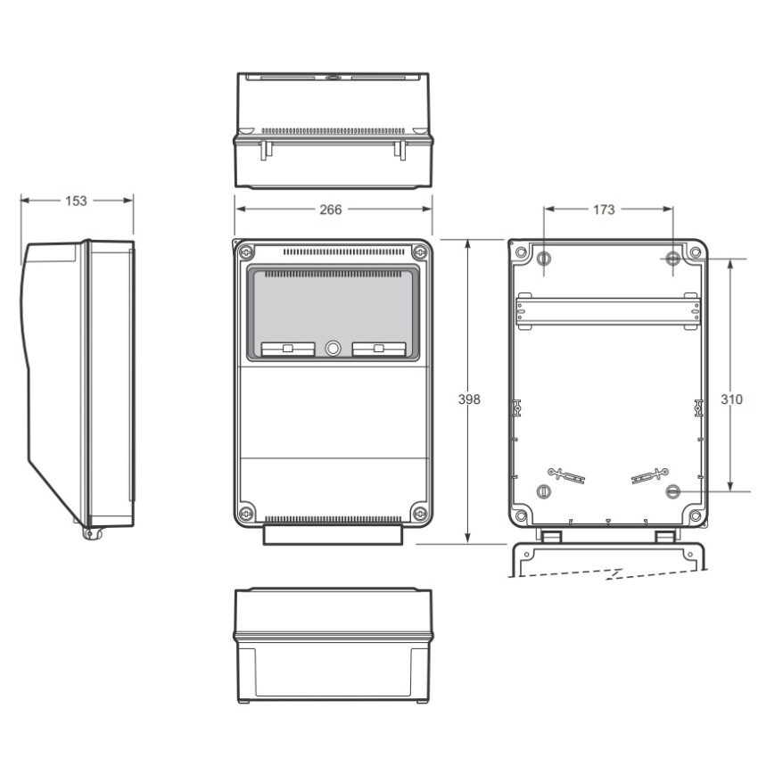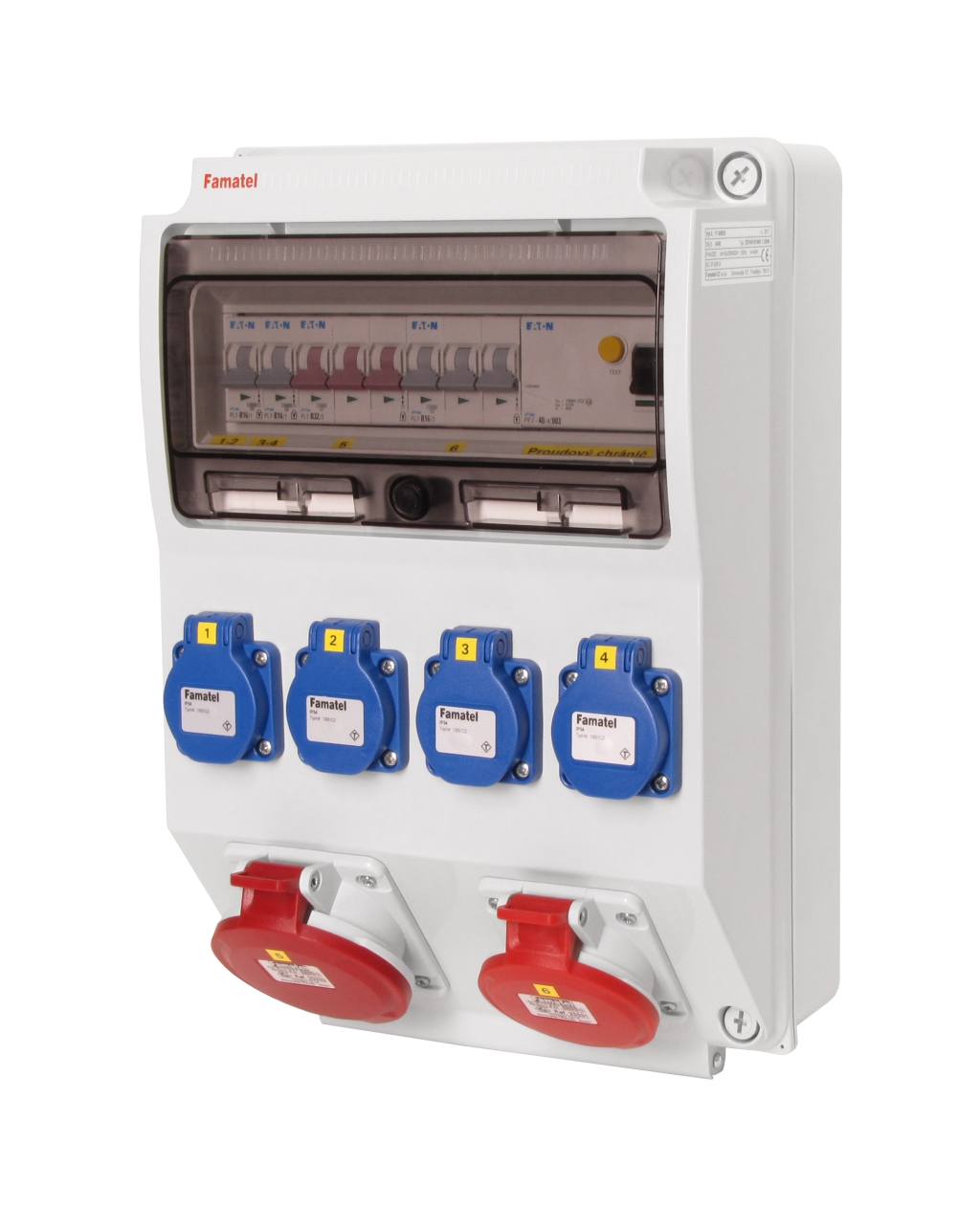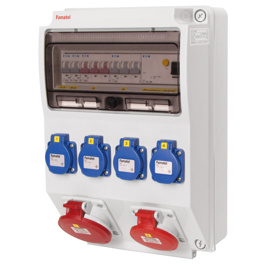 Zásuvková skříň (rozváděč nízkého napětí) FAMATEL v340-ZSF40101000.1 /3959 IP54 jištěná s chráničem 40/4/003, zásuvky 4x230V/16A (s ochranným kolíkem dle ČSN), 1x400V/16A/5pól, 1x400V/32A/5pól, jistící přístroje EATON 10kA: 2xPL7-B16/1, 1xPL7-B16/3, 1xPL7-B32/3, PF7-40/4/003 na vstupu (citlivost na reziduální proud 30mA), použité pouzdro: 3959 - celkem k dispozici 12mod. míst, rozměry: 398x266x153mm, plastová, materiál ABS, IK08, zkouška žhavou smyčkou 650°C, bezhalogenová a UV odolná, montáž na povrch, barva: světle šedá, rozsah teplot -25°C +85°C, aplikované normy: IEC 61439-3 (Rozváděče nízkého napětí - Část 3: Rozvodnice určené k provozování laiky (DBO), balení: 1ks (fólie), zásuvky na 230V/16A s ochranným kolíkem dle ČSN, polykarbonátové okénko, jistící prvky EATON, PE svorkovnice součástí (6x16mm2), N svorkovnice součástí (6x16mm2), stěny s předlisovanými vstupy pro vyvrtání vstupního otvoru a následné osazení příslušnou vývodkou (pro CYKY 5x6; 4x10; 5x10 => M25; pro CYKY 5x16 => M32), max. připojitelný vstupní kabel = 4x25 nebo 5x16 (Cu), dodáno s průvodní dokumentací: štítkem rozváděče, návodem pro obsluhu a montáž, krycím listem (charakteristiky rozhraní), protokolem o kusové zkoušce, ES prohlášením o shodě, schématem zapojení a zkouškou oteplení pro rozváděče nízkého napětí. Pro montáž na hořlavé podklady je nutné použít nehořlavou podložku.