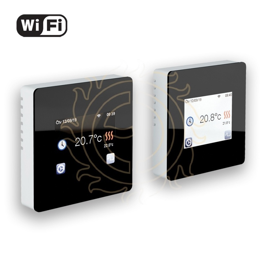 Integrovaným wifi modul pro připojení k domácí síti, vzdálené ovládání pomocí cloud serveru (aplikace pro iOS, Android), barevný dotykový displej, CZ menu. Uživatelsky volitelné snímaní teplot (jen prostoru, podlahy, nebo obou hodnot), PWM regulace nebo pevná teplotní diference. Týdenní program: 4 přednastavené programy, 3 uživatelské (až 10 teplotních změn denně), režim dovolené, ručního ovládání, protimrazové ochrany nebo úplného vypnutí. Zámek displeje, počítání provozních hodin, funkce otevřené okno, možnost kalibrace čidel. Podlahová sonda 3m je součástí balení. Umístění na KU 68.