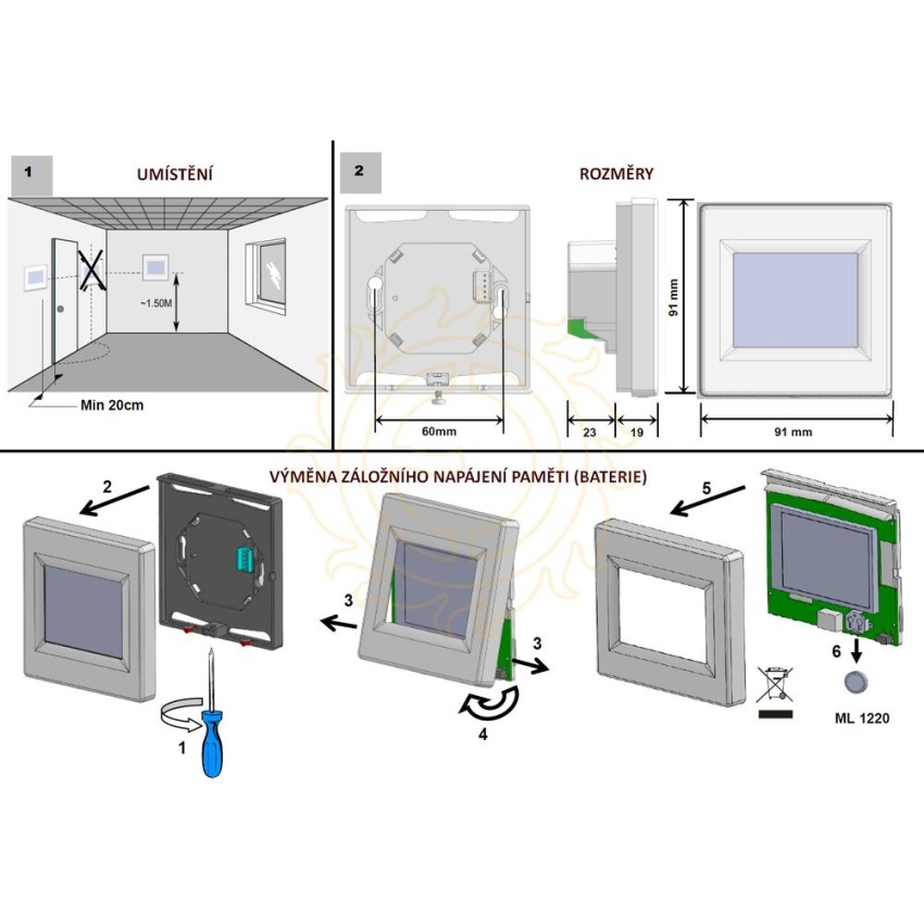 Spínací kontakt 16A; krytí IP 21; výměnná záložní baterie; spořič displeje (denní režim: po 1min pokles intenzity podsvícení na 25%; noční režim: po 1min pokles intenzity podsvícení na 25%, po 5min zhasnutí displeje); podlahová sonda 3m je součástí balení. Umístění na na KU 68.
