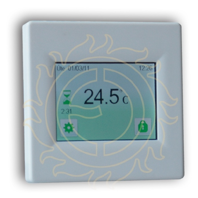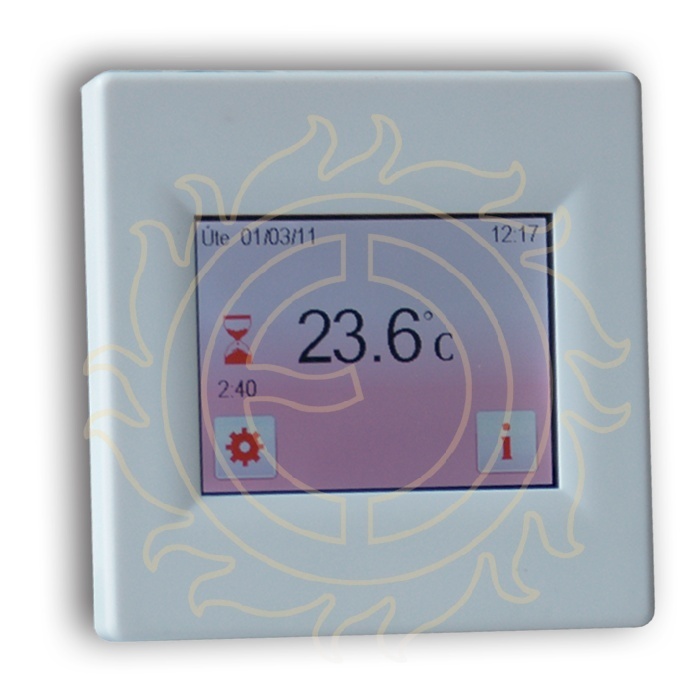 Barevný dotykový displej, volitelná barva pozadí, CZ menu. Uživatelsky volitelné snímaní teplot - jen prostoru, podlahy, nebo obou hodnot, PWM regulace nebo pevná teplotní diference. Týdenní program - 4 přednastavené programy, 3 uživatelské (až 10 teplotních změn denně), režim dovolené, ručního ovládání, protimrazové ochrany nebo úplného vypnutí. Zámek displeje, počítání provozních hodin, funkce otevřené okno, možnost kalibrace čidel.