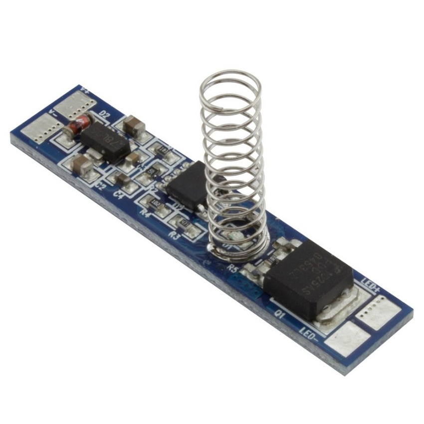 Dotykový spínač určený pro přímou montáž do AL profilu. Pro ovládání funkcí nevyužívá vodivé spojení s AL profilem, ale ovládá se pomocí dotyku na difuzoru (plexi) v místě spínače. Místo indikuje svítící modrá LED.