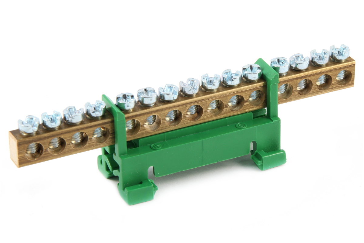 Propojovací můstek nebo též nulový můstek SP 15/Z SEZ - 15 svorek pro ochranné PE vodiče, barva zelená, maximální průřez pevného vodiče 16mm2, 660V, 63A, na DIN lištu