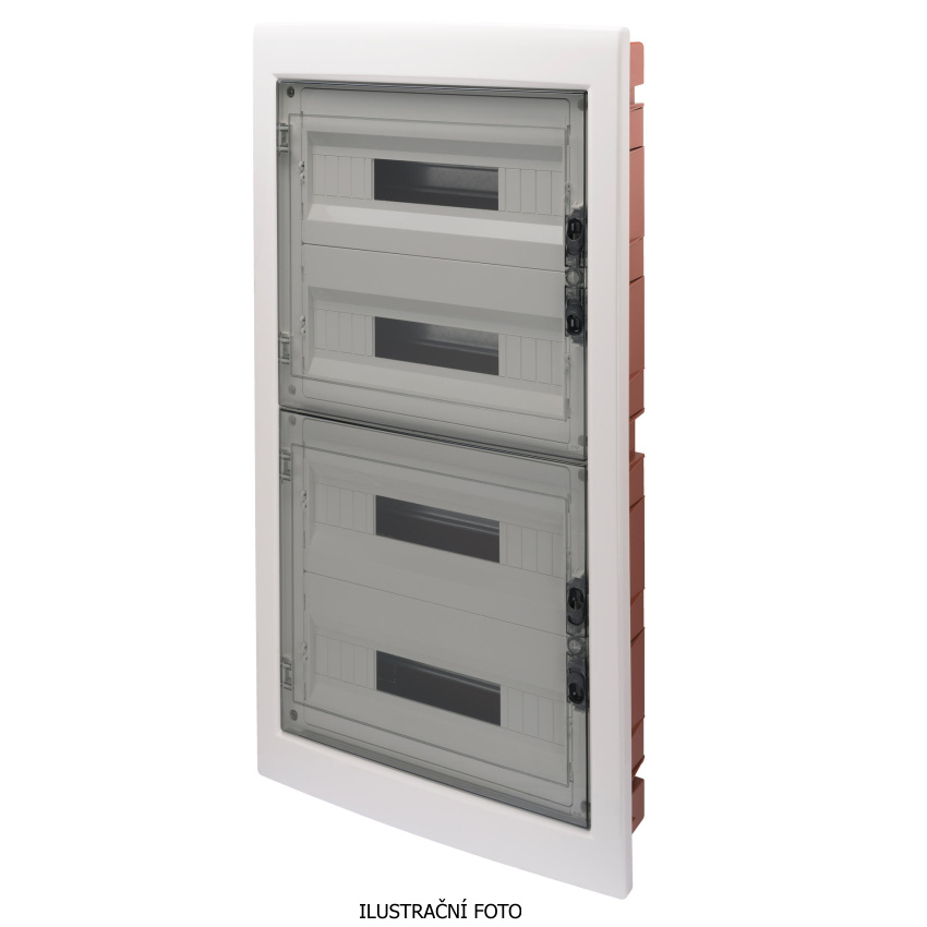 Vestavná, průhledná kouřová dvířka, otevíraní zboku, vyjímatelný rám, 72modulová, 4 řady (4x18 modulů), krytí IP40,barva bílá, montážní hloubka 95mm.