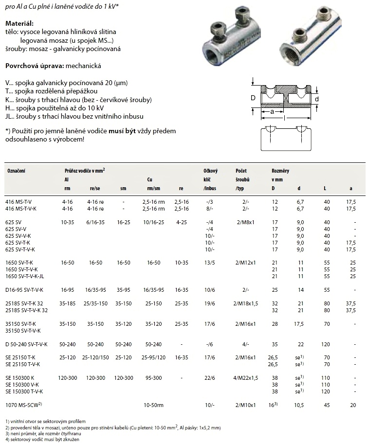 | Jmenovitý průřez | 50 - 240 mm2 |
