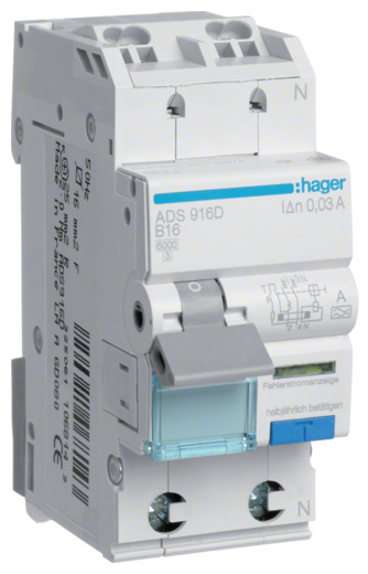 Hager ADS916D Kombi chr.,B; 1+N; 6kA; 0,03A; 16A,A, QC