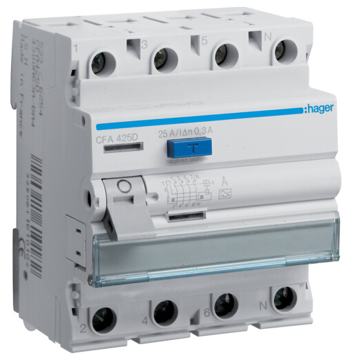 Hager CFA425D Proudový chránič 4 pól. 25 / 0,3 A, A