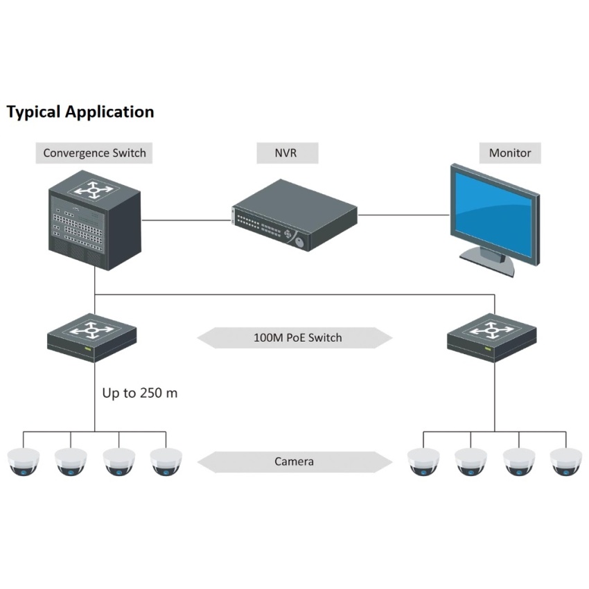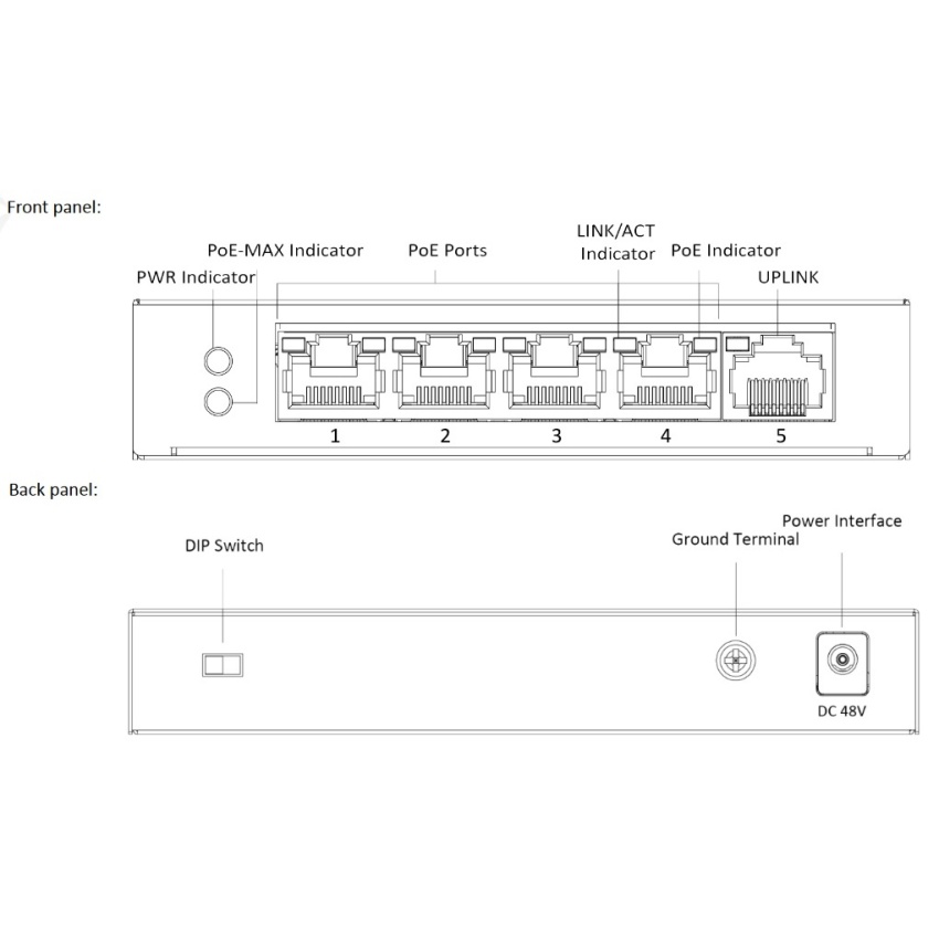 5/4 PoE switch, 4x PoE porty 10/100 Mbps, 1x uplink 10/100 Mbps. Dva pracovní režimy: Standard 4x 100Mbps na 100m a Extended mode 4x 10Mbps až na 250m. Network protokol IEEE802.3, 802.3u, 802.3x. Přepínací kapacita switche 1Gbps. Přepěťová ochrana do 6KV.Pracovní teplota: 0 - 40C°. Napájení: 48Vdc/0,8A (napájecí zdroj v balení). Hmotnost 0,141kg
