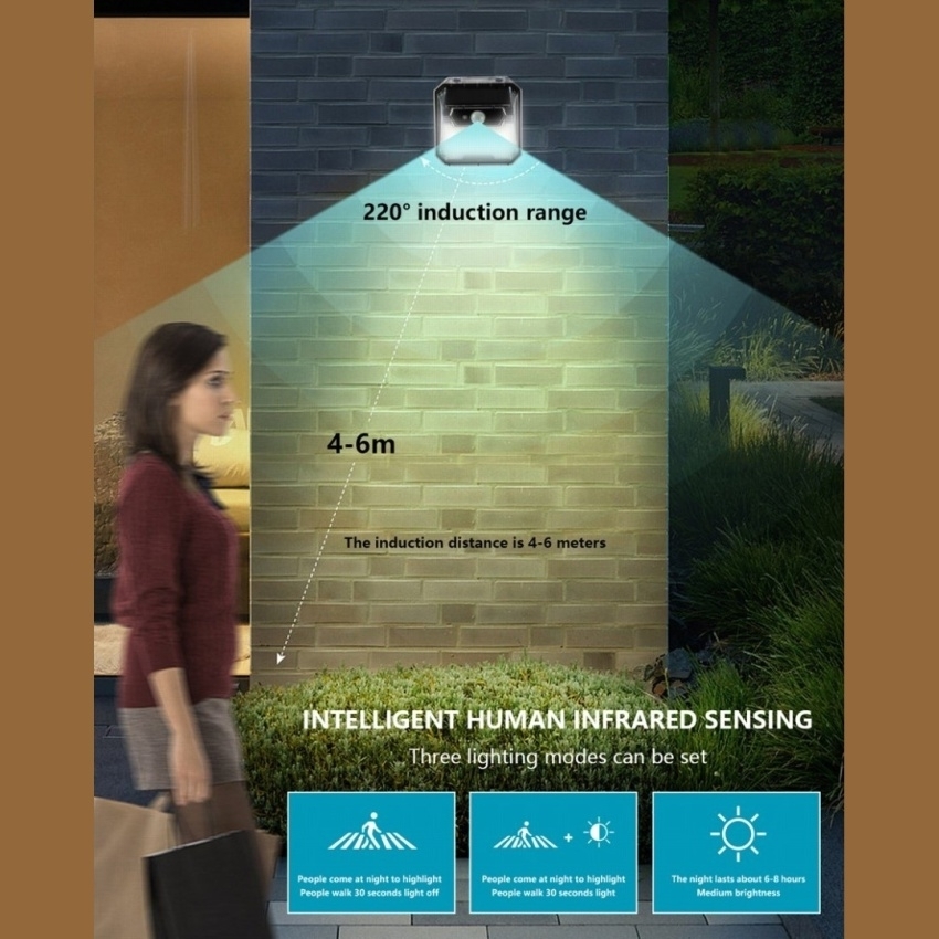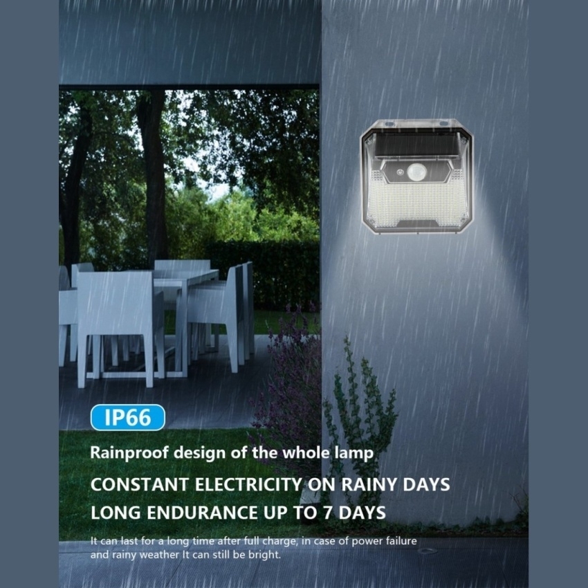 Po setmění se světlo buďautomaticky rozsvítí (mód 1), nebo se rozsvítí po zaznamenání pohybu (mód 2,3).Doba svícení závisí na slunečním svitu, místě instalace, povětrnostních podmínkách a délce denního světla. Úsporné solární nástěnné LED svítidlo se nabíjí sluneční energií, má nulové náklady na provoz. Stupeň krytí IP65 zaručuje voděodolnost reflektoru.