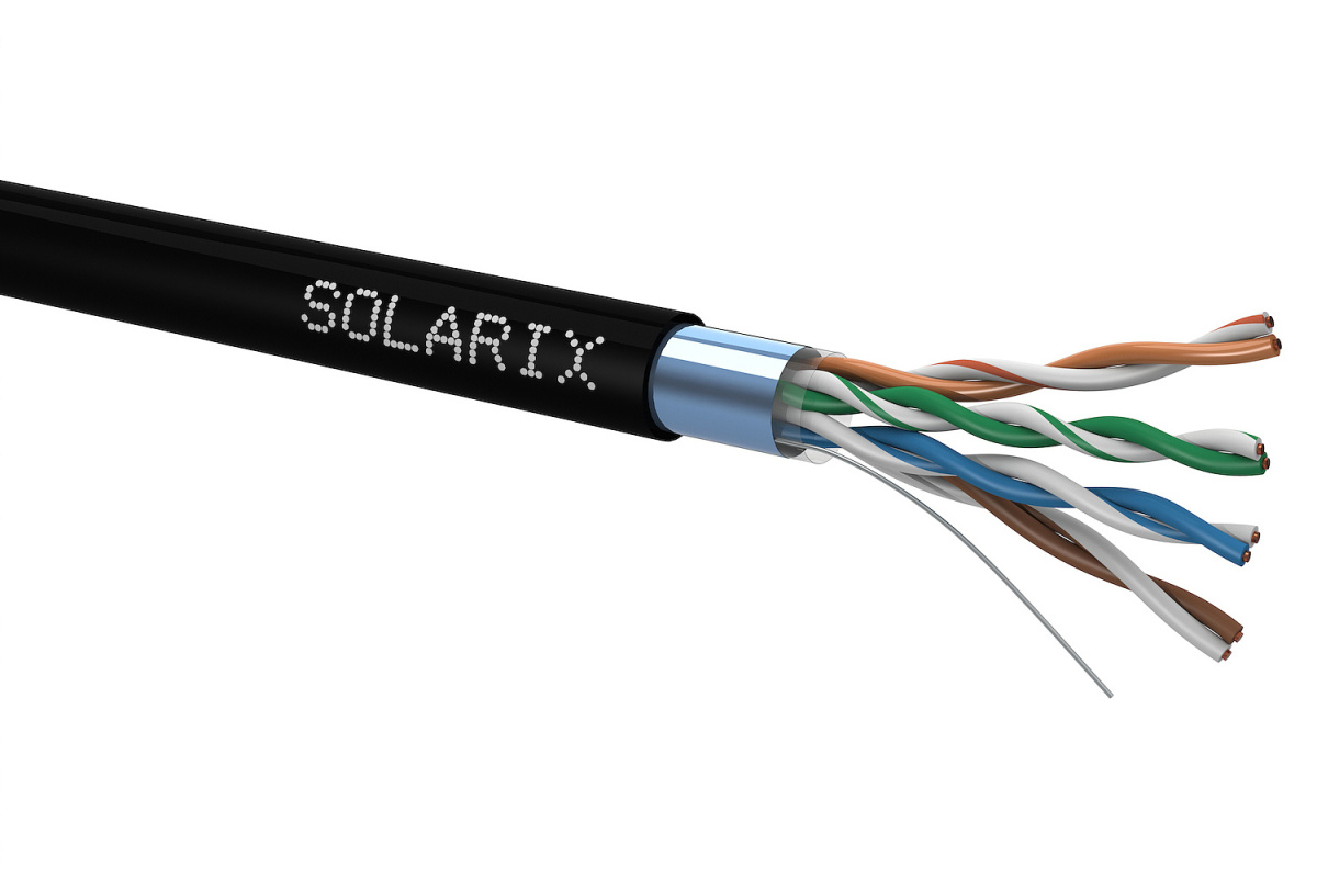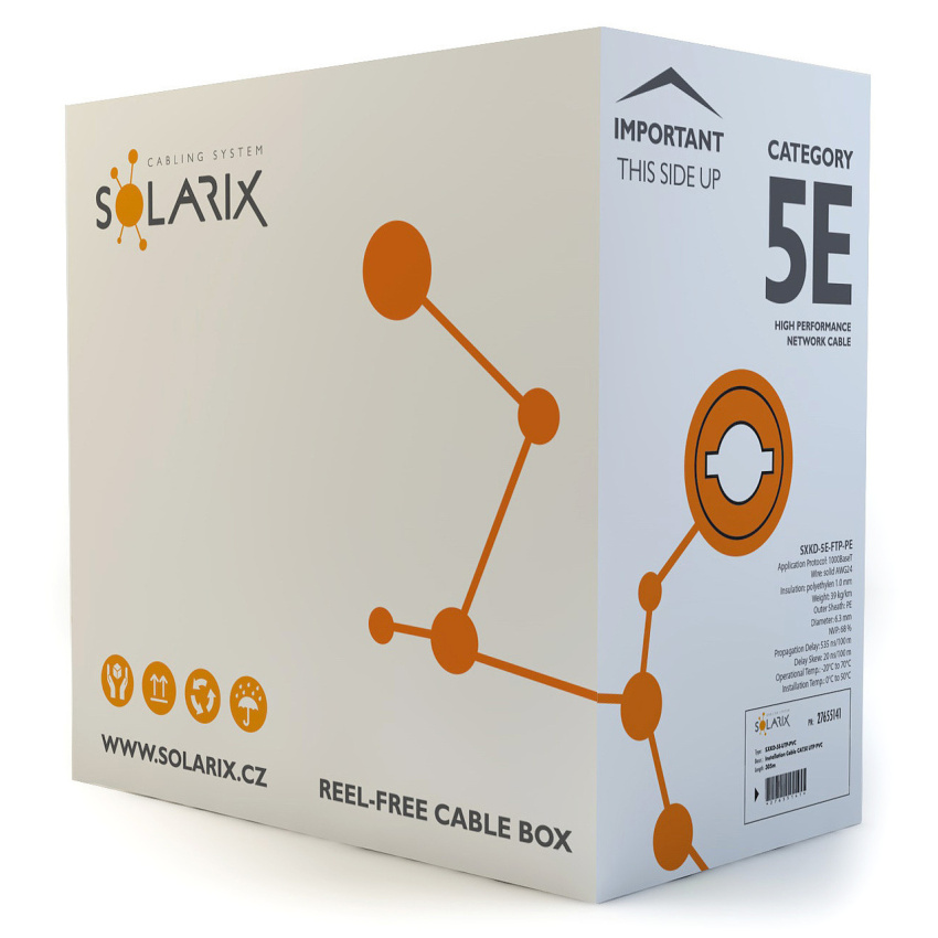 Instalační kabel Solarix s označením SXKD-5E-FTP-PE je spolehlivý venkovní stíněný kabel kategorie 5E, který je určený pro provoz ethernetových protokolů, včetně 2.5GBASE-T a 5GBASE-T*. Konstrukce kabelu je F/UTP, typ pláště UV stabilní PE s třídou reakce na oheň Fca a stupněm krytí IP67. Vodiče kabelu jsou vyrobeny z kvalitního měděného drátu s čistotou mědi 99,97%. Kabel bez problémů splňuje požadavky z mezinárodních standardů ISO/IEC 11801, EN 50173 a ANSI/TIA 568.2-D. Stejně jako ostatní kabely Solarix, je i kabel SXKD-5E-FTP-PE značen metráží po 1 m v rozsahu od 0 do 305 m. Kabel je dodáván ve vysoce odolném třívrstvém leštěném kartónovém boxu (vždy barevně odlišeném podle typu kabelu), na kterém jsou uvedeny všechny nezbytné produktové informace, včetně čárových kódů, výrobní šarže, popisu a nejdůležitějších technických parametrů. Při instalaci do země doporučujeme vždy použít HDPE chráničku.