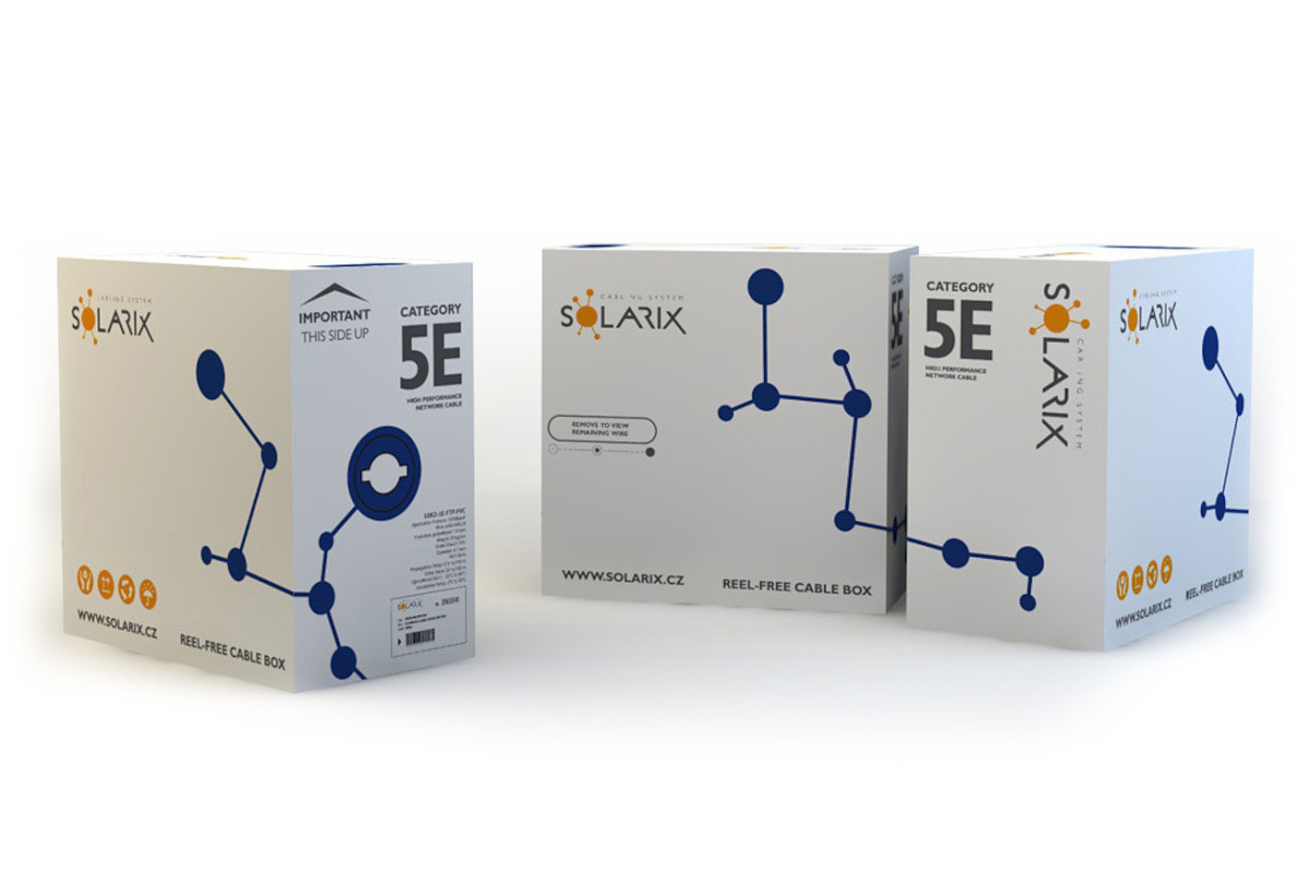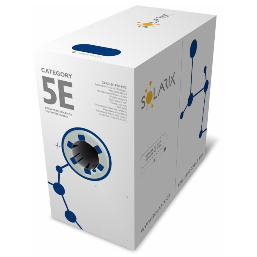 Instalační kabel Solarix s označením SXKD-5E-FTP-PVC je spolehlivý stíněný kabel kategorie 5E, který je určený pro provoz ethernetových protokolů, včetně 2.5GBASE-T a 5GBASE-T*. Konstrukce kabelu je F/UTP, typ pláště PVC s třídou reakce na oheň Eca. Vodiče kabelu jsou vyrobeny z kvalitního měděného drátu s čistotou mědi 99,97%. Kabel bez problémů splňuje požadavky z mezinárodních standardů ISO/IEC 11801, EN 50173 a ANSI/TIA 568.2-D. V případě CPR (nařízení EU č. 305/2011) je kabel testován u nezávislé laboratoře FORCE TECHNOLOGY v systému posuzování vlastností AVCP 3. Stejně jako ostatní kabely Solarix, je i kabel SXKD-5E-FTP-PVC značen metráží po 1 m v rozsahu od 0 do 305 m. Kabel je dodáván ve vysoce odolném třívrstvém leštěném kartónovém boxu (vždy barevně odlišeném podle typu kabelu), na kterém jsou uvedeny všechny nezbytné produktové informace, včetně čárových kódů, výrobní šarže, popisu a nejdůležitějších technických parametrů.