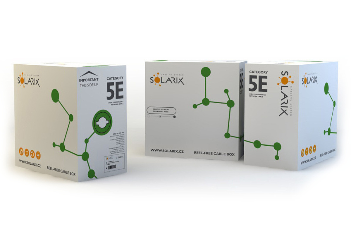 Instalační kabel Solarix s označením SXKD-5E-UTP-PVC je spolehlivý nestíněný kabel kategorie 5E, který je určený pro provoz ethernetových protokolů, včetně 2.5GBASE-T a 5GBASE-T*. Konstrukce kabelu je U/UTP, typ pláště PVC s třídou reakce na oheň Eca. Vodiče kabelu jsou vyrobeny z kvalitního měděného drátu s čistotou mědi 99,97%. Kabel bez problémů splňuje požadavky z mezinárodních standardů ISO/IEC 11801, EN 50173 a ANSI/TIA 568.2-D. V případě CPR (nařízení EU č. 305/2011) je kabel testován u nezávislé laboratoře FORCE TECHNOLOGY v systému posuzování vlastností AVCP 3. Stejně jako ostatní kabely Solarix, je i kabel SXKD-5E-UTP-PVC značen metráží po 1 m v rozsahu od 0 do 305 m. Kabel je dodáván ve vysoce odolném třívrstvém leštěném kartónovém boxu (vždy barevně odlišeném podle typu kabelu), na kterém jsou uvedeny všechny nezbytné produktové informace, včetně čárových kódů, výrobní šarže, popisu a nejdůležitějších technických parametrů.