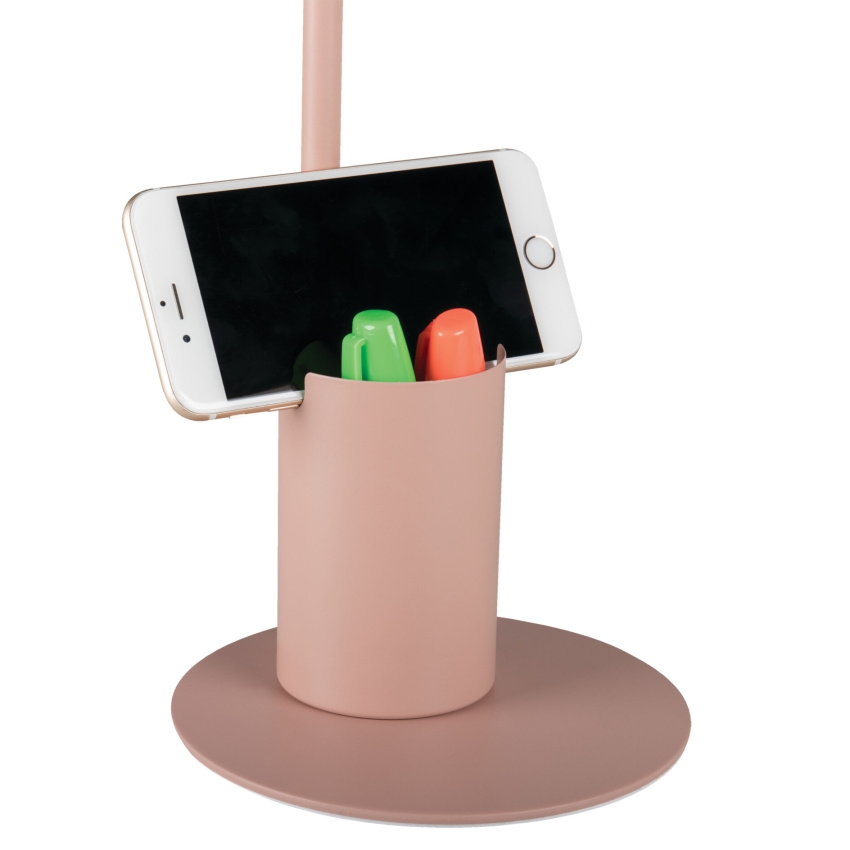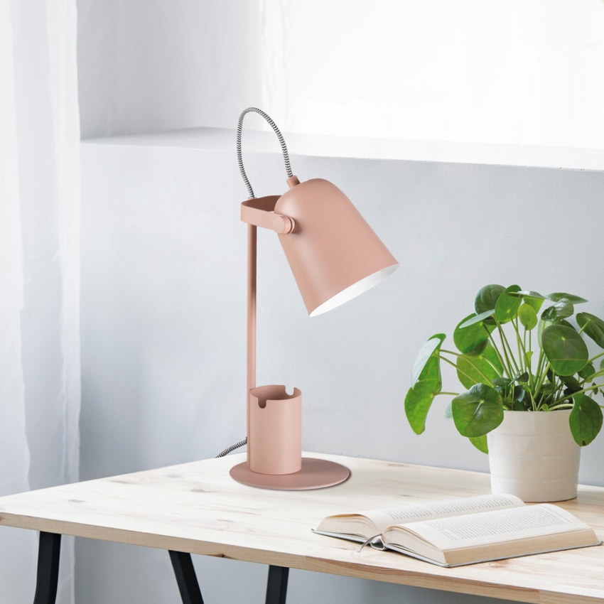 Kancelářská stolní lampa RAIBO E27 - Kanlux RAIBO je módní retro stolní lampa. Je k dispozici ve 4 pastelových barvách a také v oblíbené černé a bílé. V základně je zabudovaný organizér s úchytem, do kterého můžete vložit telefon, pera nebo brýle. Velké stínidlo, do kterého lze namontovat žárovku s paticí E27, má široký rozptyl světla. Je zde vidět retro vliv, ale také smysl pro detail a solidní zpracování (ocel). Pozornost jsme věnovali i spodní straně lampy a přidali jsme pěnovou podložku, aby lampa nepoškrábala stůl.
