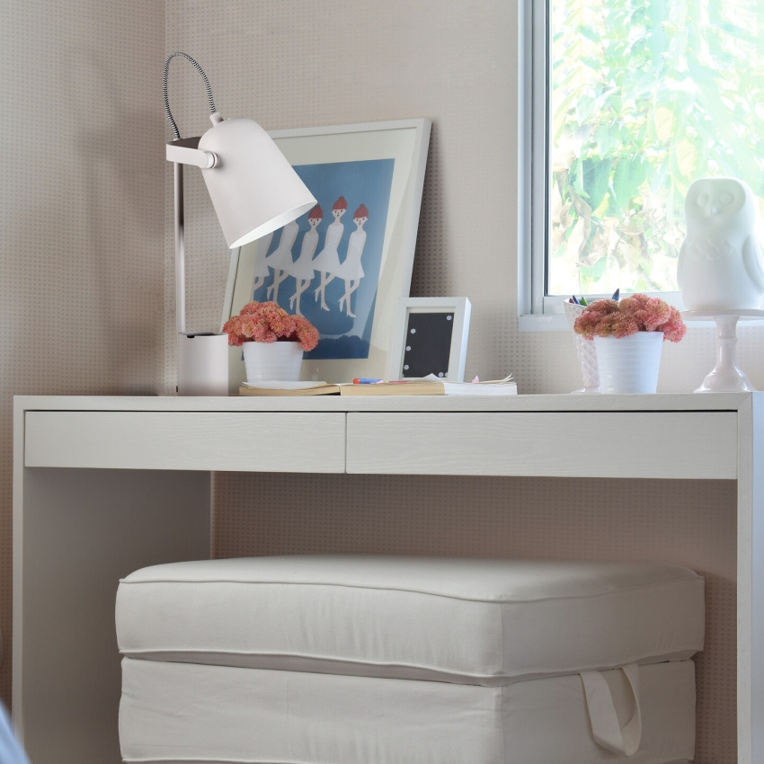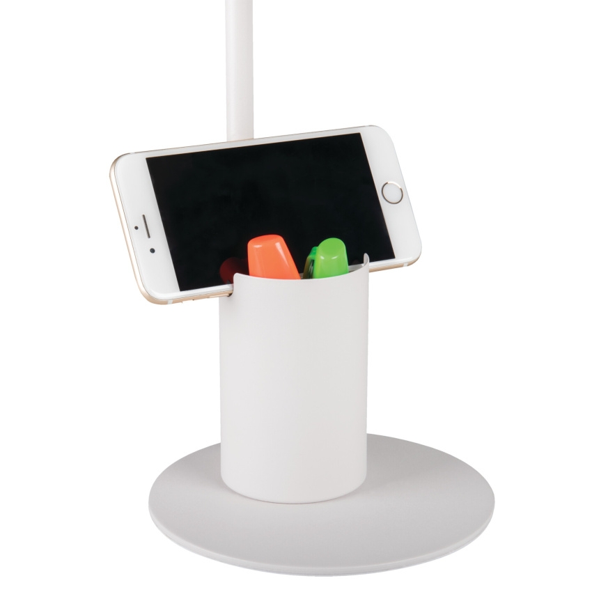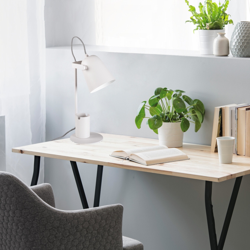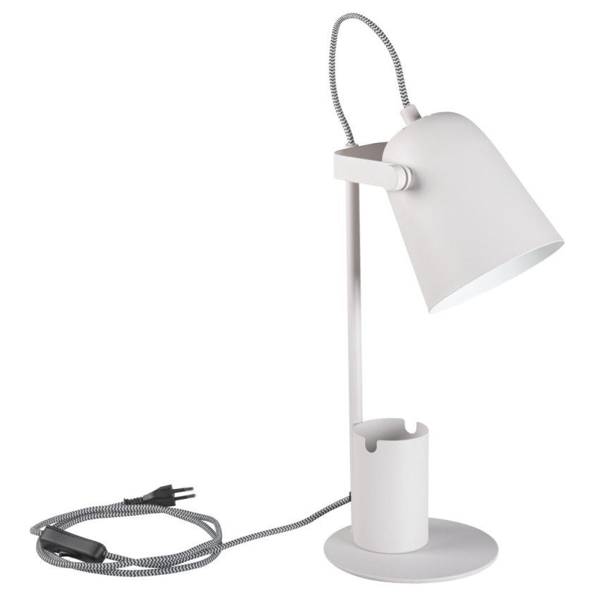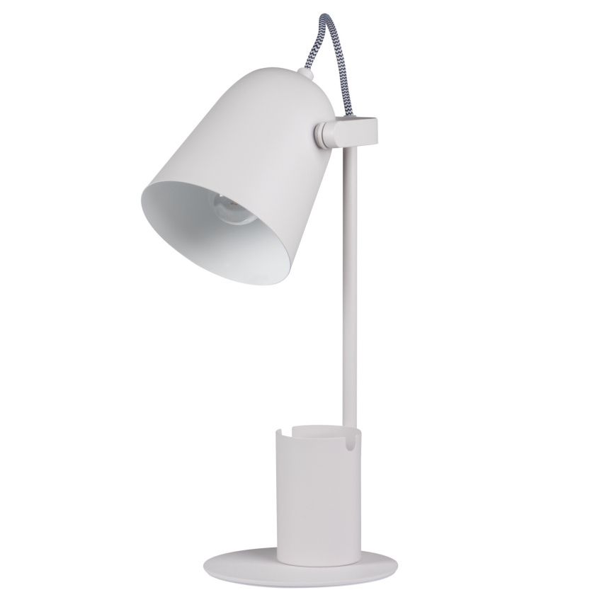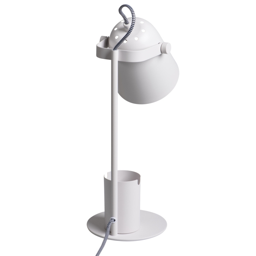 Kancelářská stolní lampa RAIBO E27 - Kanlux RAIBO je módní retro stolní lampa. Je k dispozici ve 4 pastelových barvách a také v oblíbené černé a bílé. V základně je zabudovaný organizér s úchytem, do kterého můžete vložit telefon, pera nebo brýle. Velké stínidlo, do kterého lze namontovat žárovku s paticí E27, má široký rozptyl světla. Je zde vidět retro vliv, ale také smysl pro detail a solidní zpracování (ocel). Pozornost jsme věnovali i spodní straně lampy a přidali jsme pěnovou podložku, aby lampa nepoškrábala stůl.